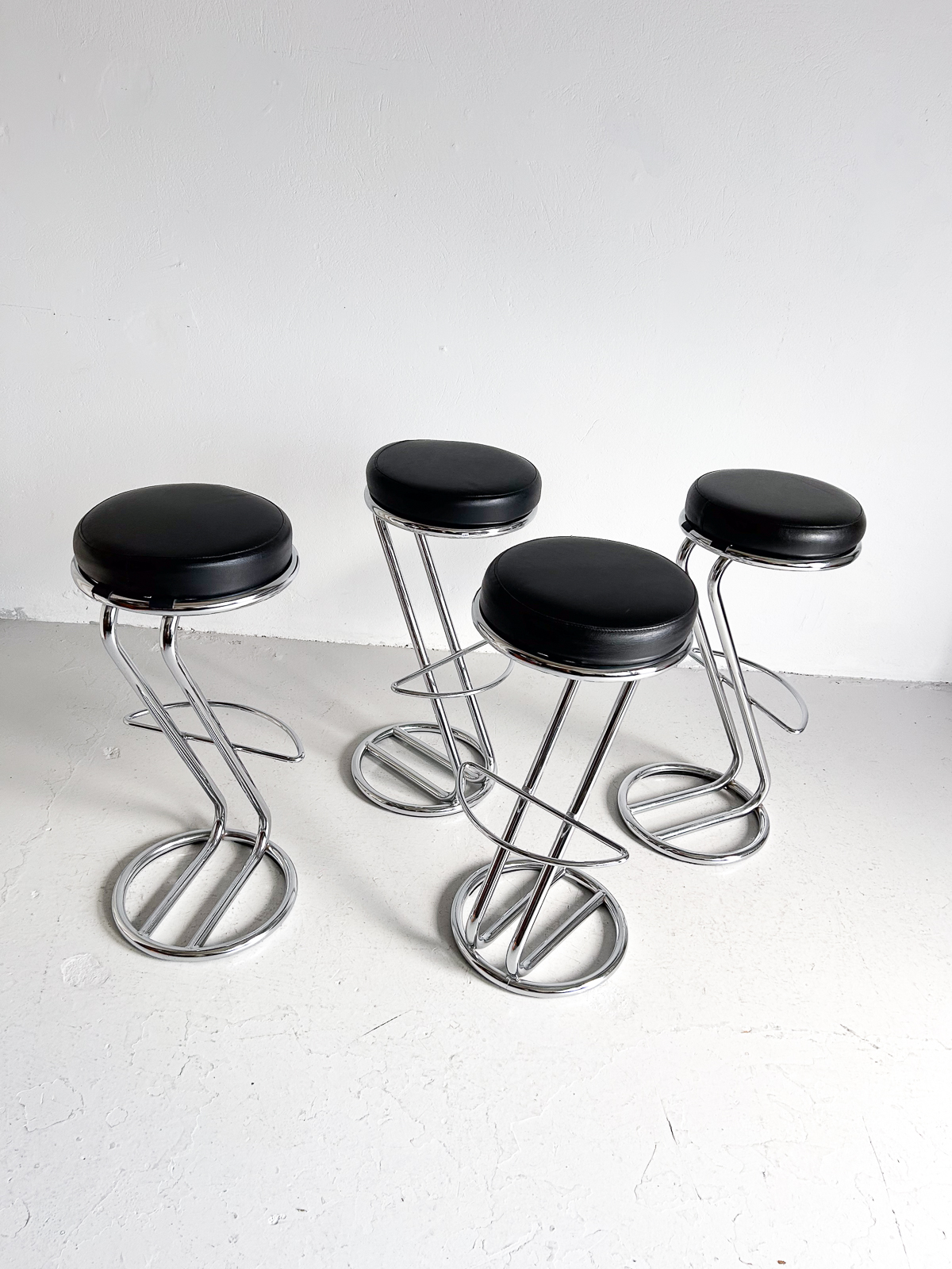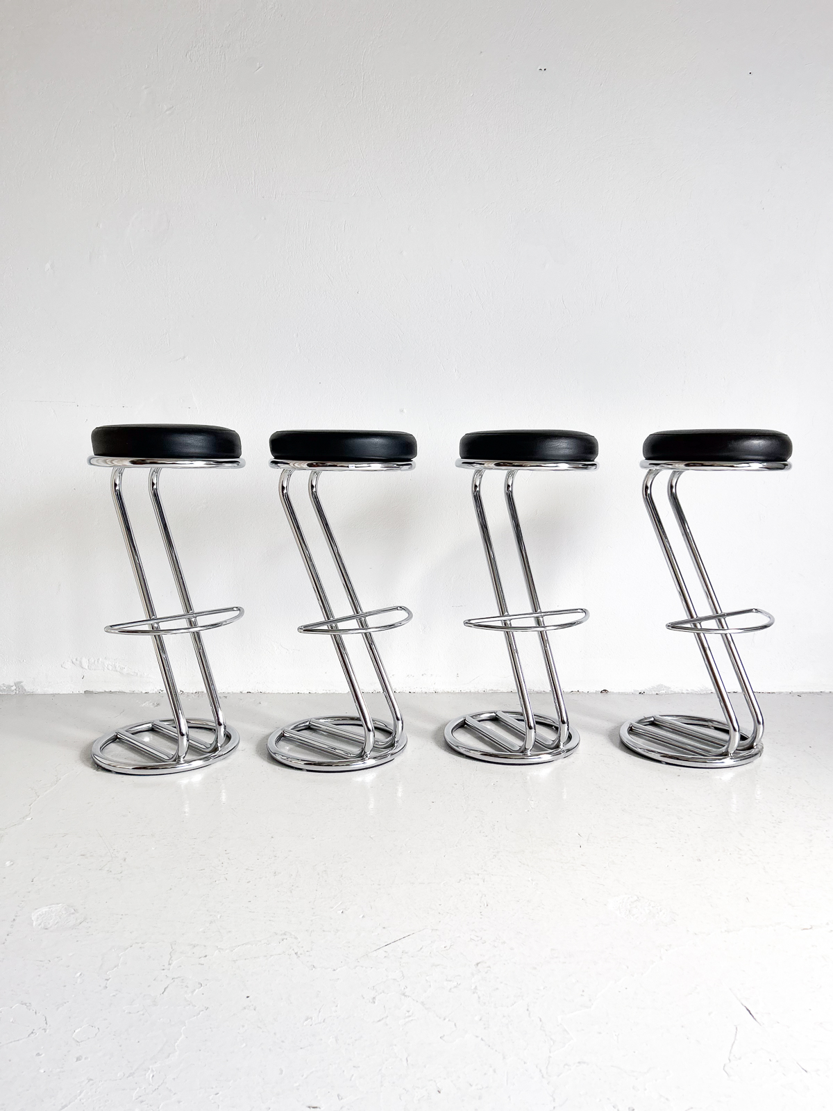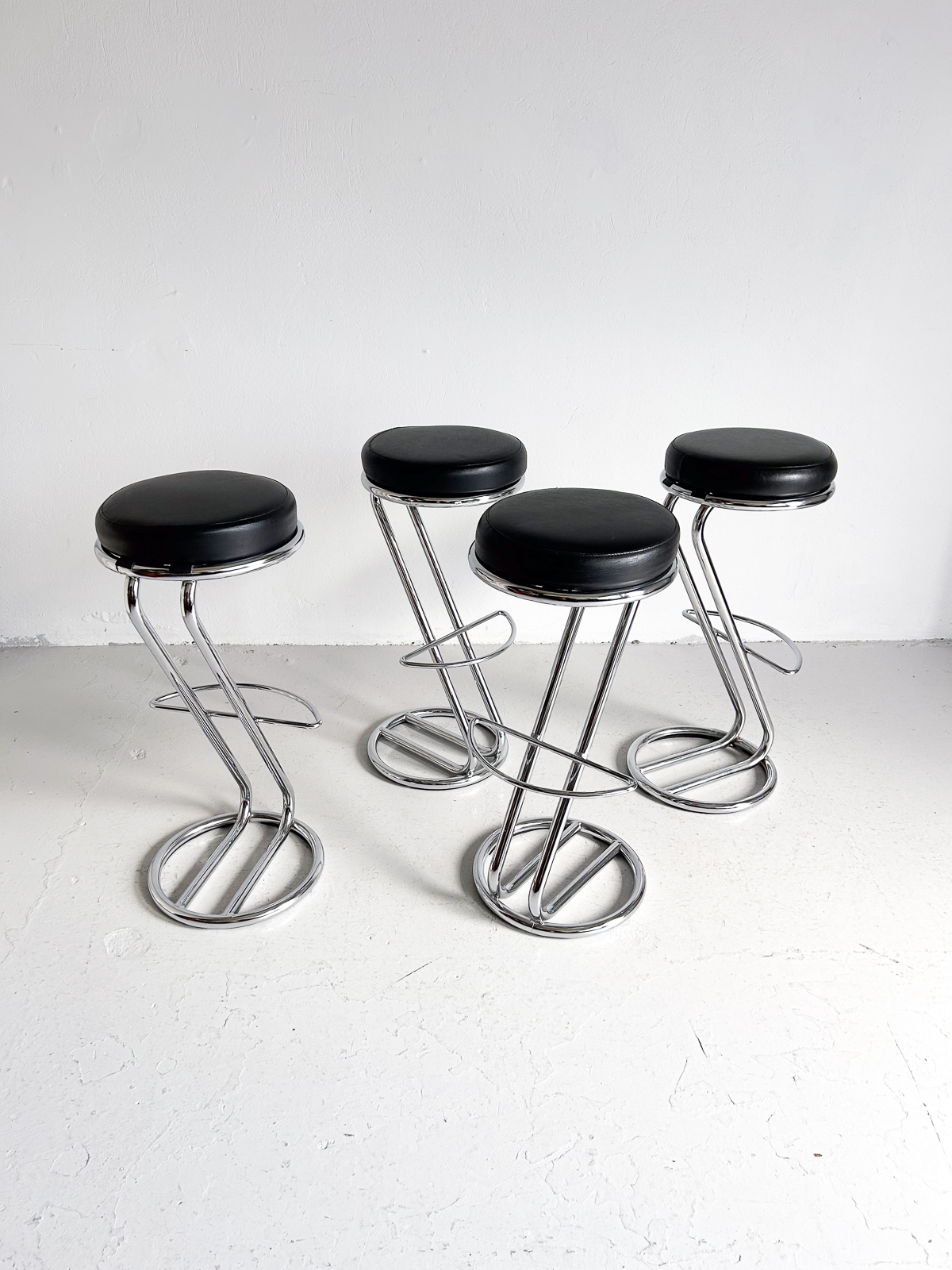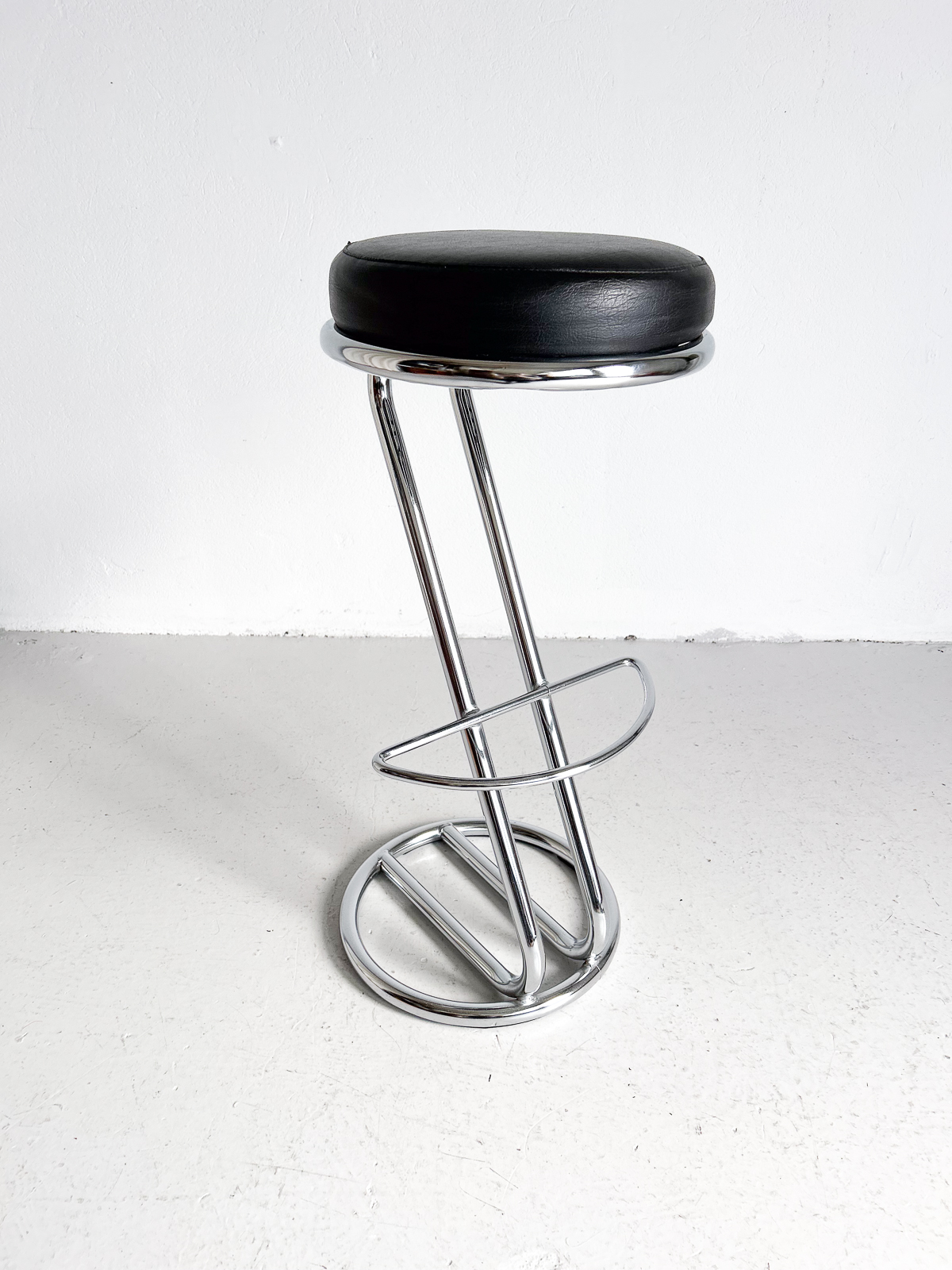 Glæsilegir barstólar, krómuð grind og svört sessa úr leðurlíki. Í mjög góðu ástandi.