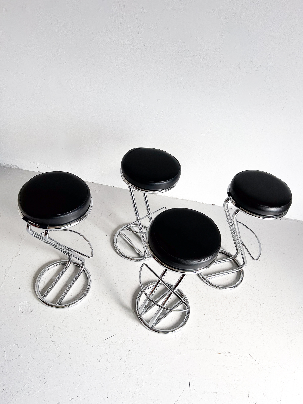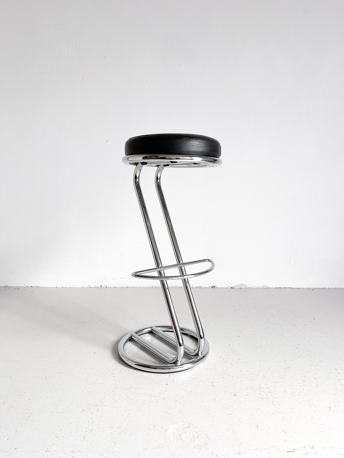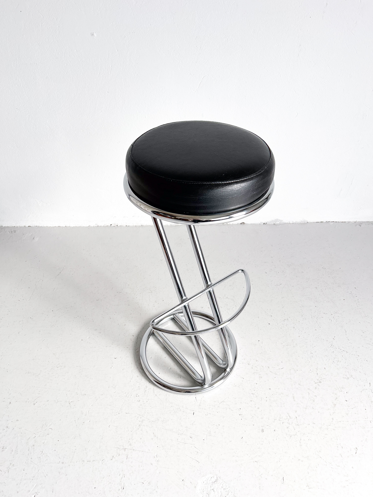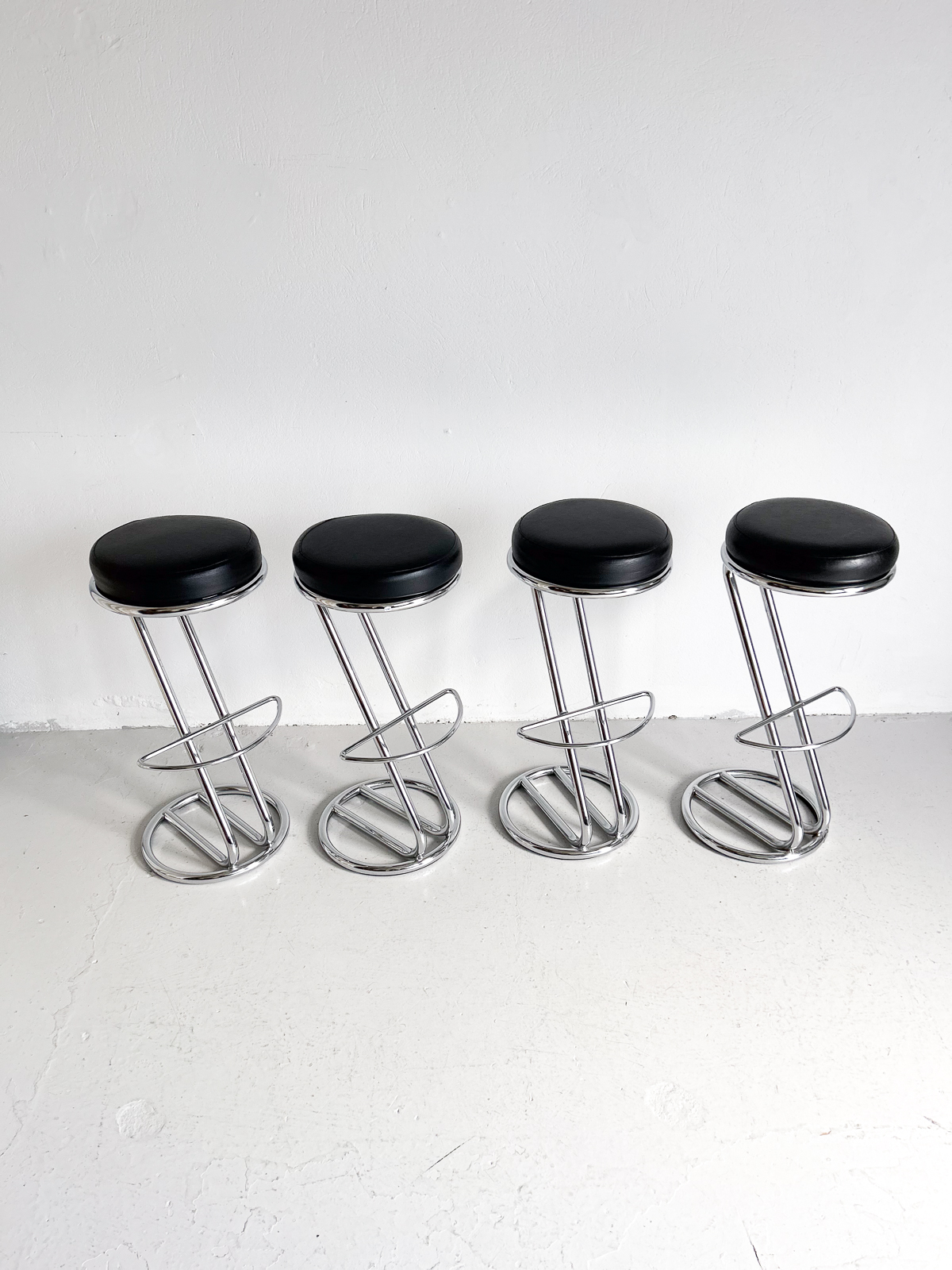 Glæsilegir barstólar, krómuð grind og svört sessa úr leðurlíki. Í mjög góðu ástandi.