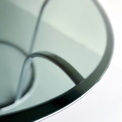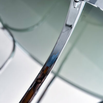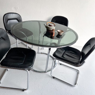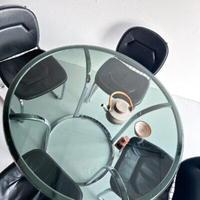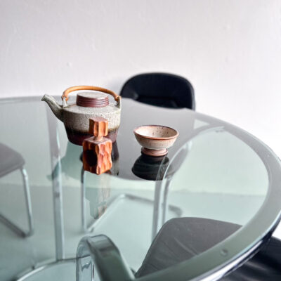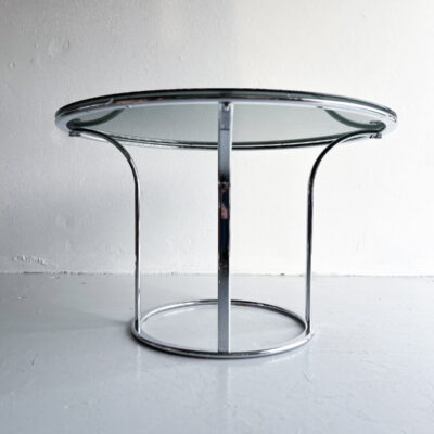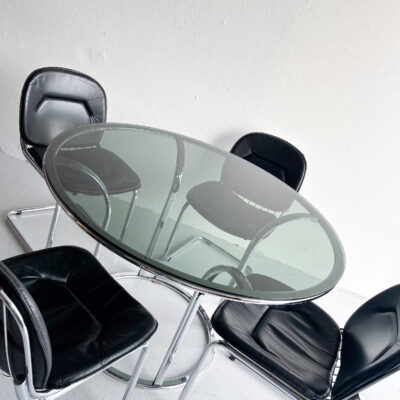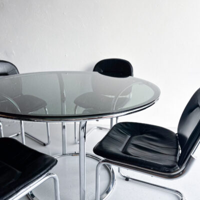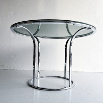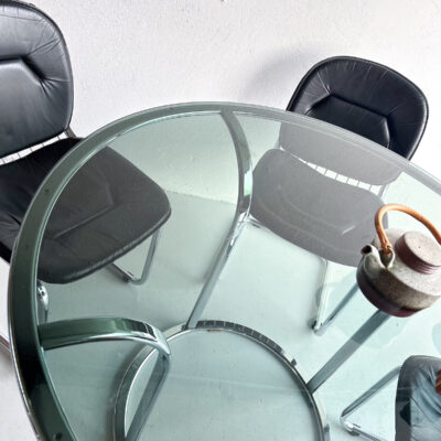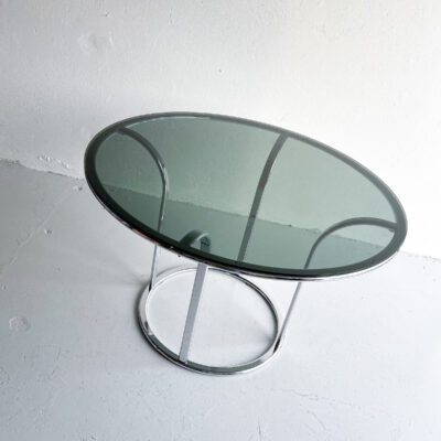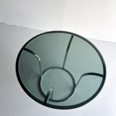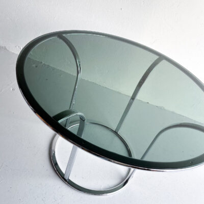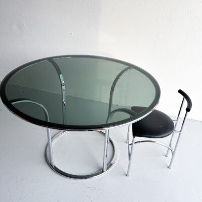 Glæsilegt borð með krómaðri grind og reyktri glerplötu. 120 cm þvermál
