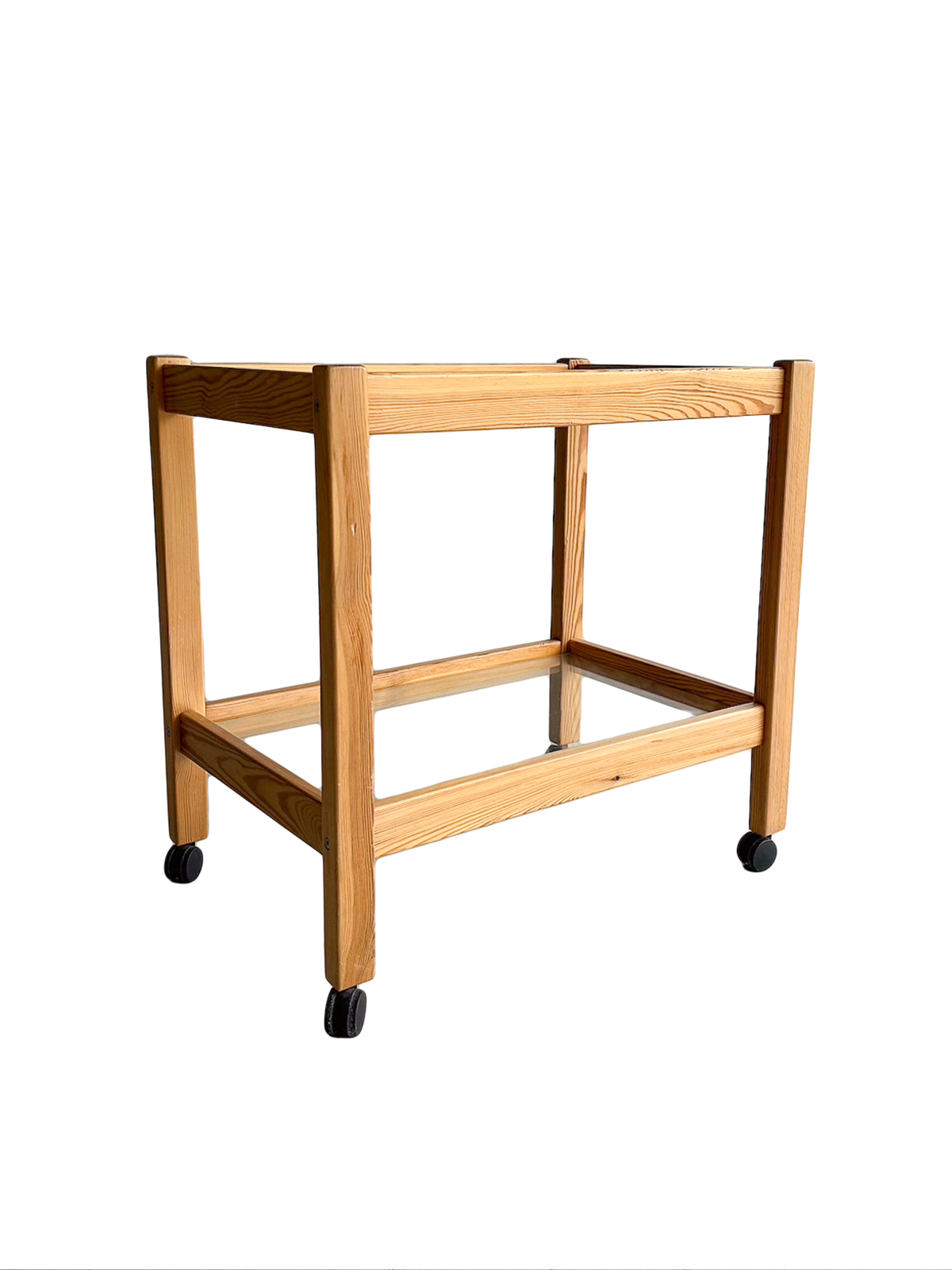 Létt og hagnýtt þjónustuborð með tveimur glerplötum og viðarramma. Hentar vel sem barborð, hliðarborð eða undir skraut og bækur. Á hjólum sem gera það auðvelt að færa á milli rýma. Tímalaus skandinavísk hönnun.