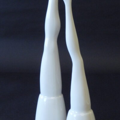Skotglös eftir Guðrúnu Öyahals. Fætur glasanna eru afsteypur af fótum fyrirmyndarparsins BARBIE OG KEN og geta vegna lögunar þeirra aðeins staðið á hvolfi.