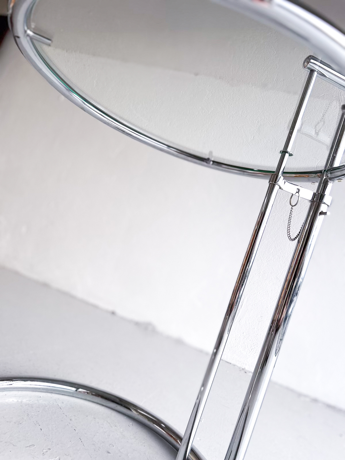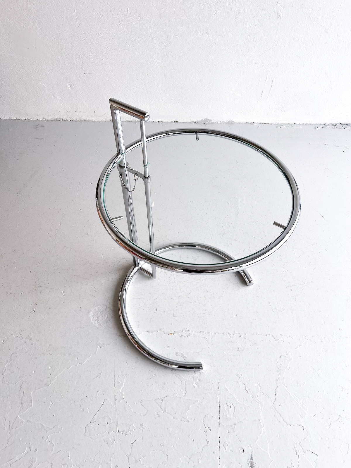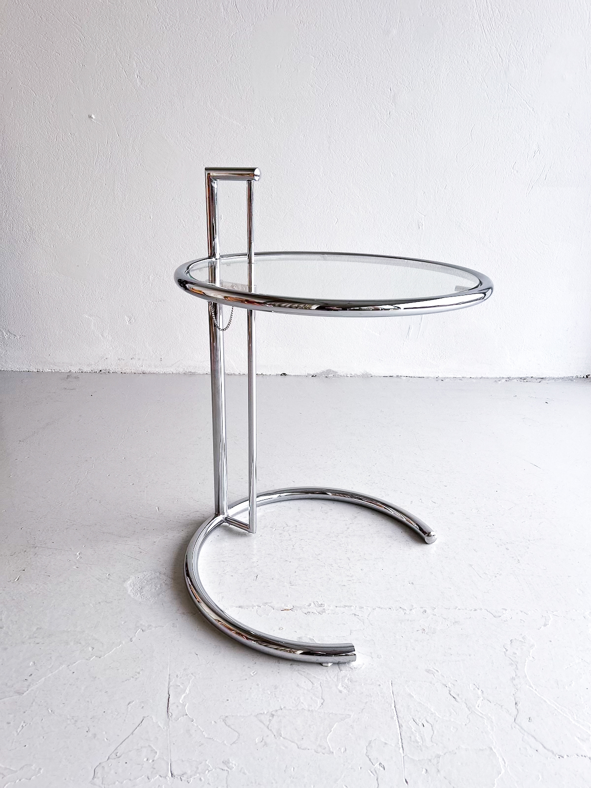 Vandað borð með krómgrind og glerplötu. Hægt að hækka og lækka eftir þörfum.