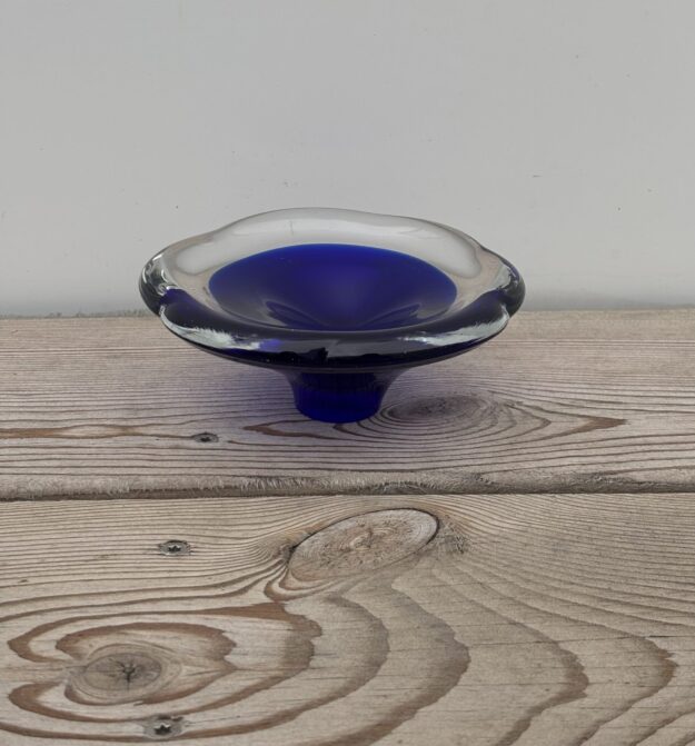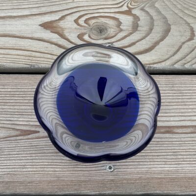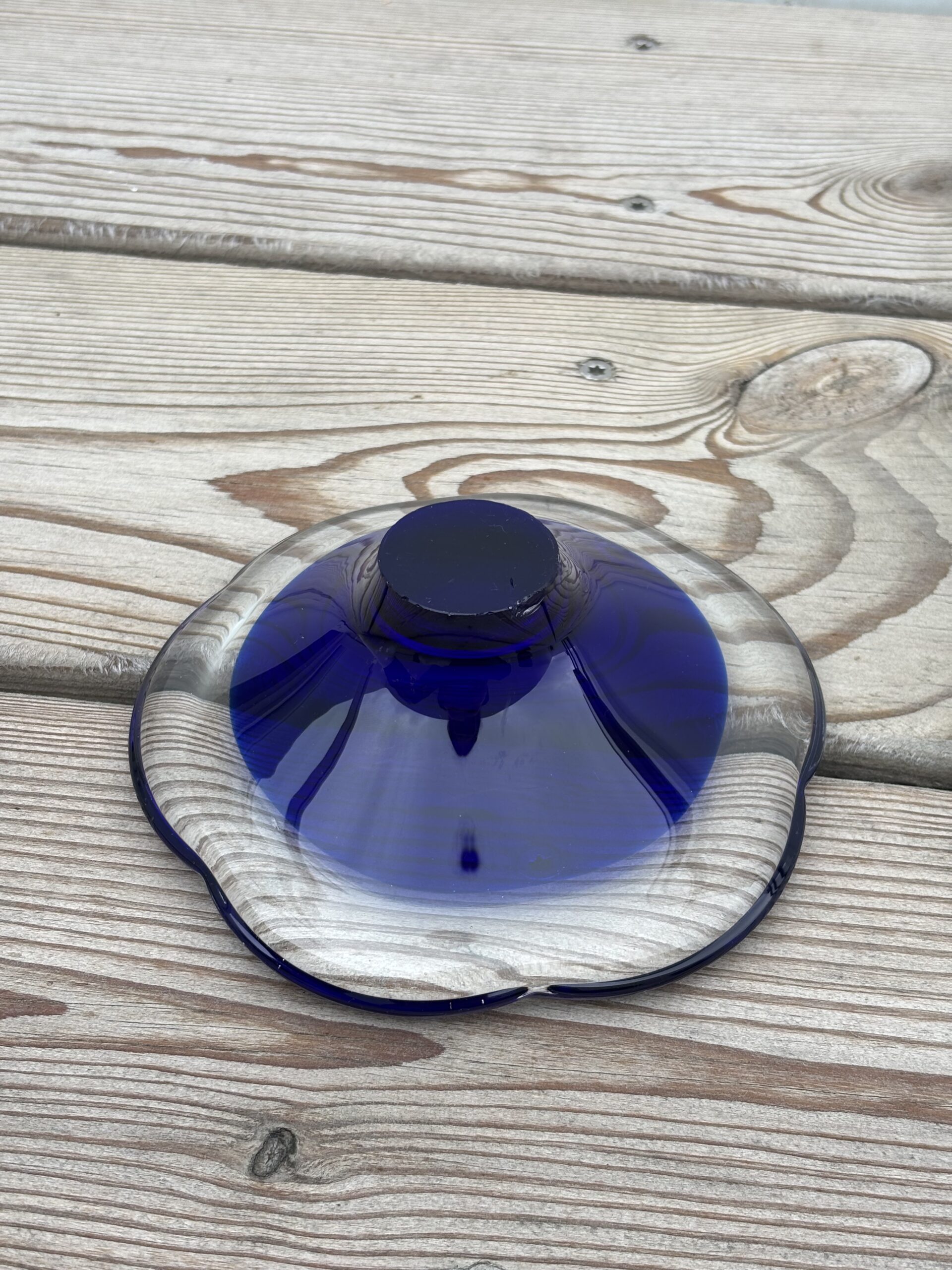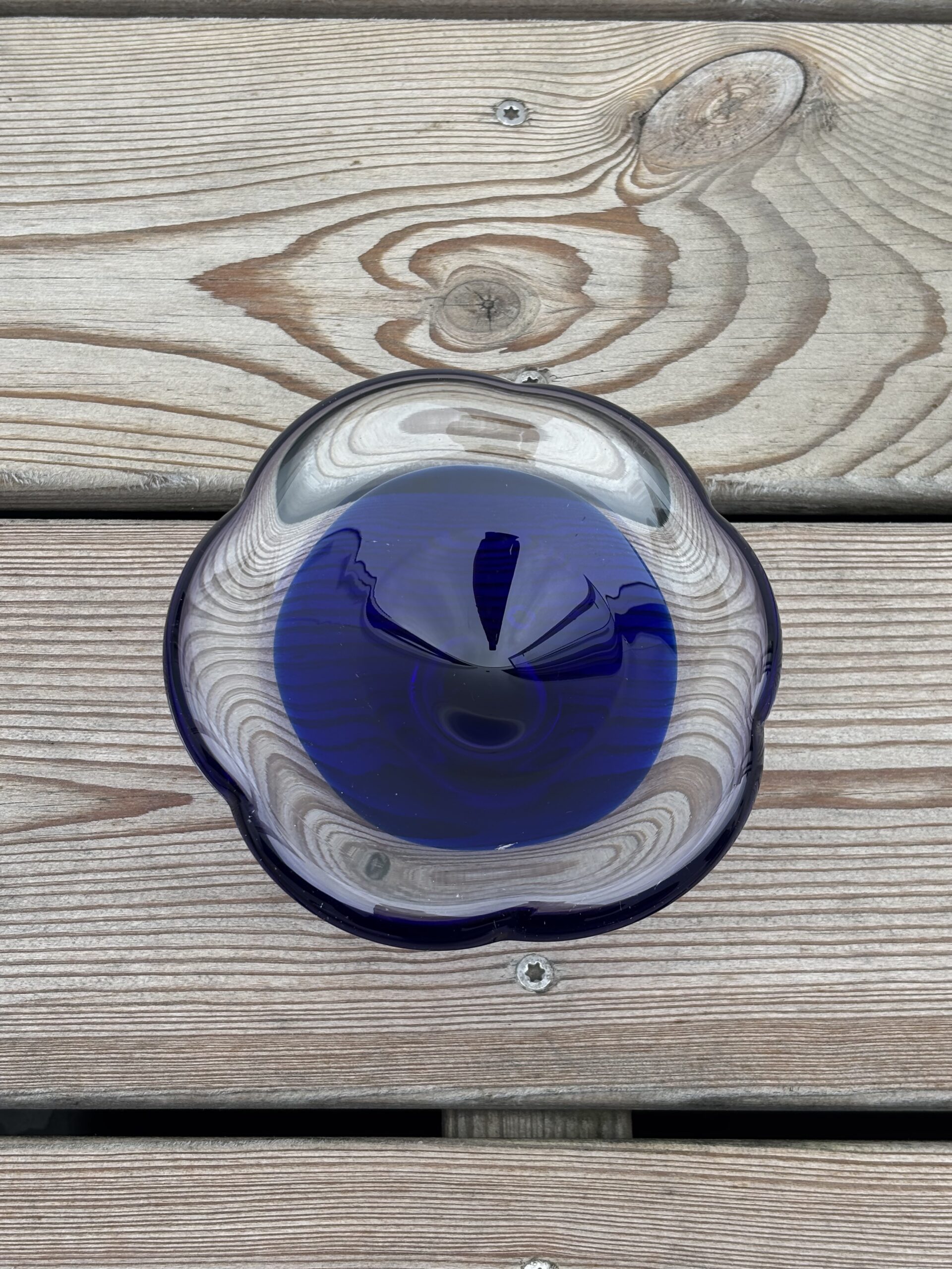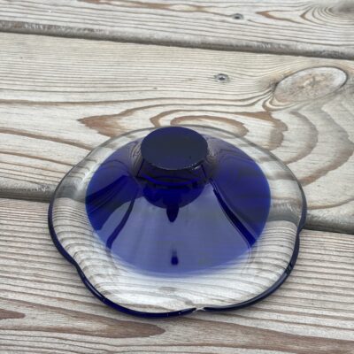Falleg glær og blá gler skál í laginu eins og blóm.