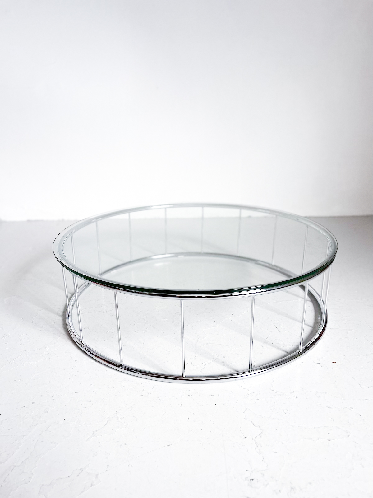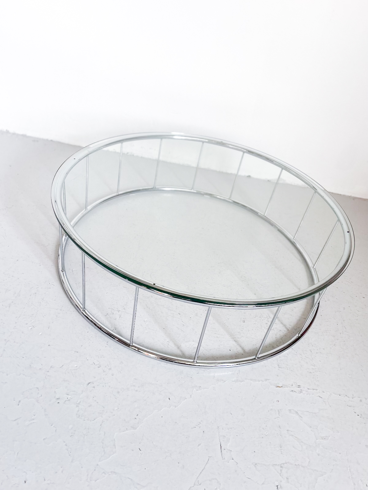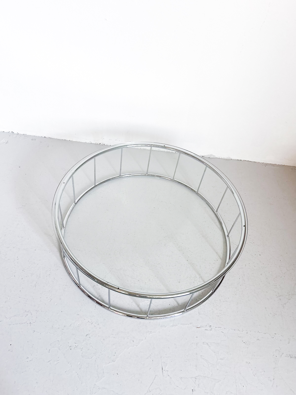 Glæsilegt sófaborð – hringlaga krómgrind með glerplötu. Gler heilt með eðlilegum notkunarmerkjum.