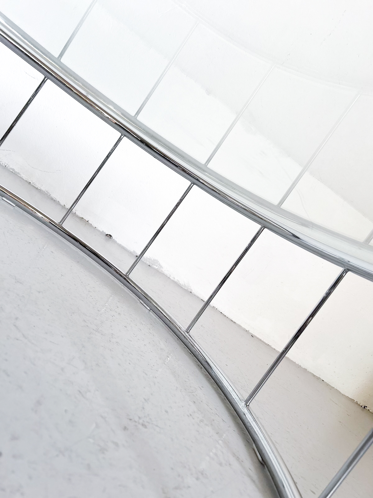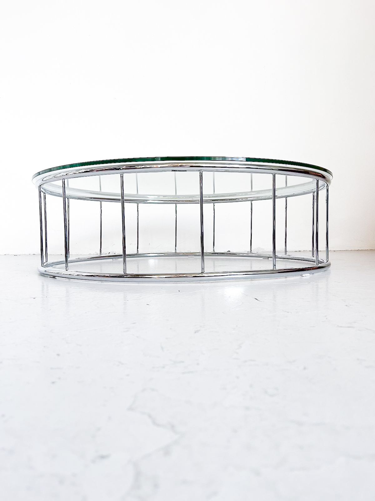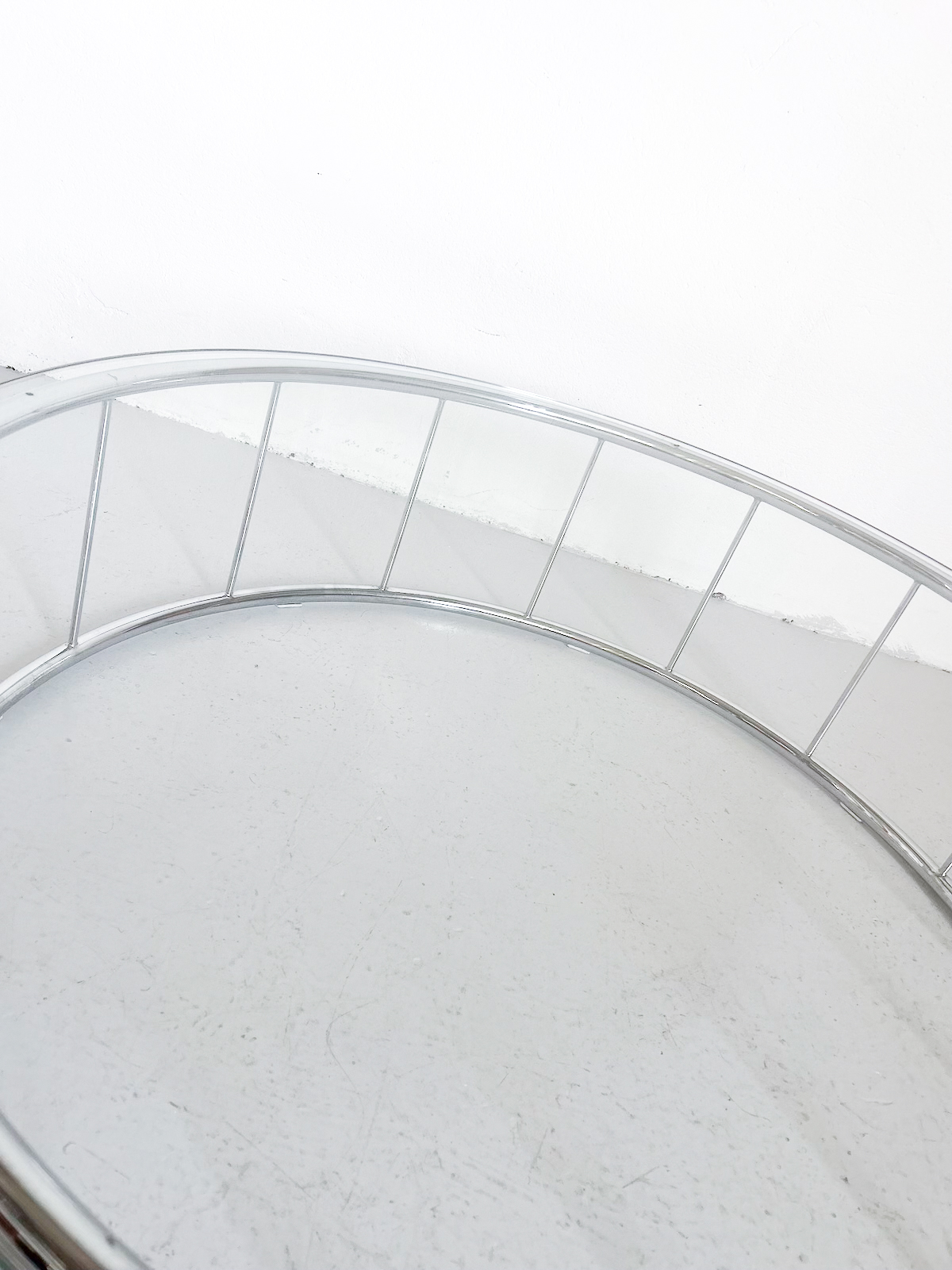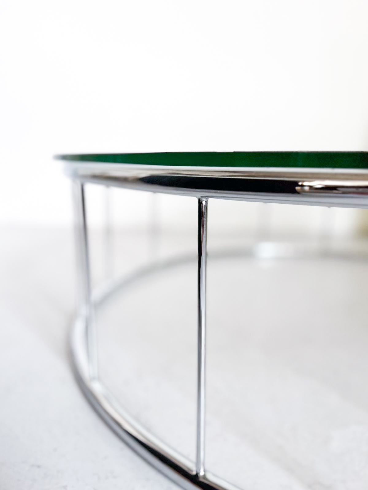 Glæsilegt sófaborð – hringlaga krómgrind með glerplötu. Gler heilt með eðlilegum notkunarmerkjum.
