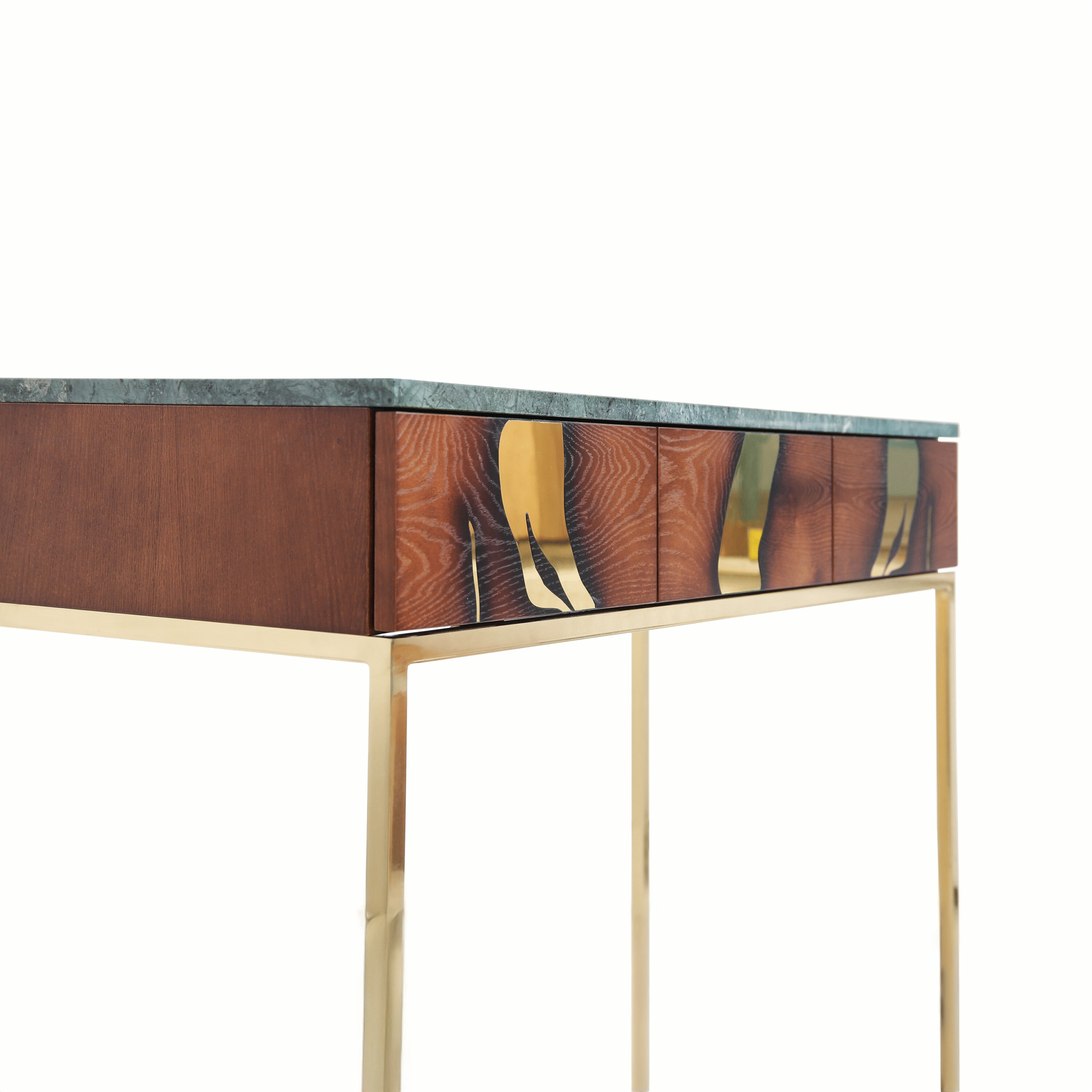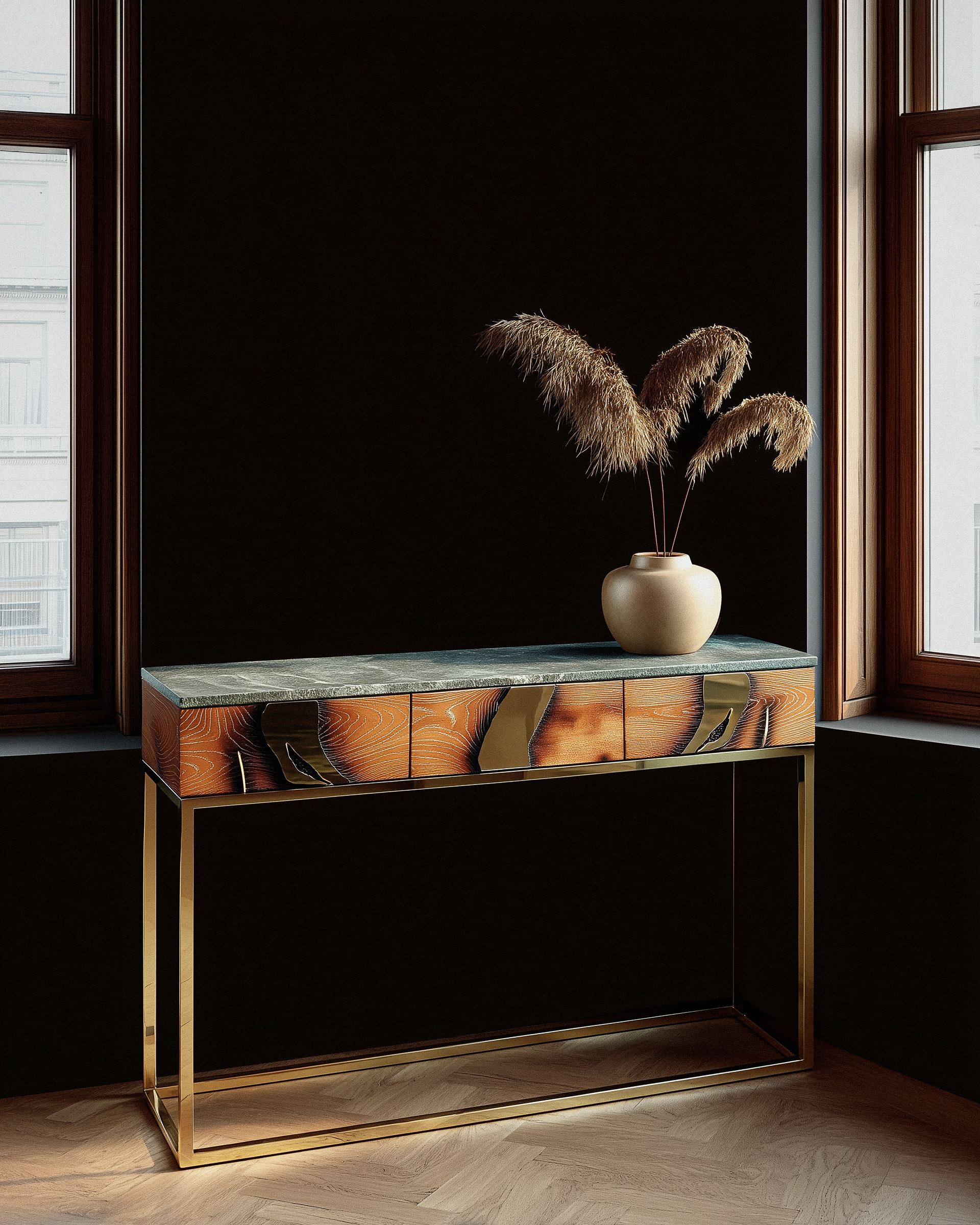 Verde Alpi marmaraplata bætir við áferð, lit og fágun, með djúpum grænum tónum sem gefa borðinu ríkulegt jafnvægi og skúlptúrlega nærveru. Það hvílir á massívum messinggrunni, þar sem hvert smáatriði er handpússað til að ná fram ljómandi áferð sem undirstrikar arkitektóníska nákvæmni hönnunarinnar.