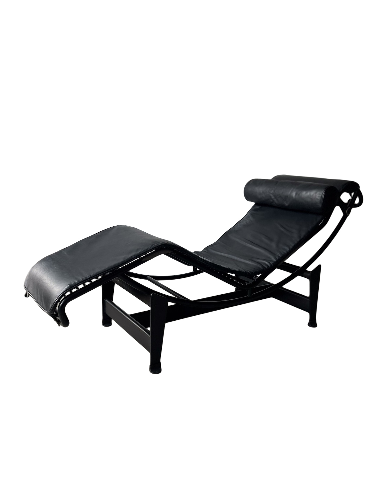 Einstakt vintage eintak af LC4 legubekknum – einum frægasta hönnunargripi 20. aldar. Bekkurinn var hannaður árið 1928 af Le Corbusier, Pierre Jeanneret og Charlotte Perriand, og hefur verið framleiddur af Cassina síðan 1965 með vottaðri upprunamerkingu. Bekkurinn er í svörtu leðri með lakkaðri stálgrind og stillanlegu baki. Ástandið er mjög gott miðað við aldur – náttúruleg slit og patína sem gefa gripnum karakter án þess að skerða notagildi.
