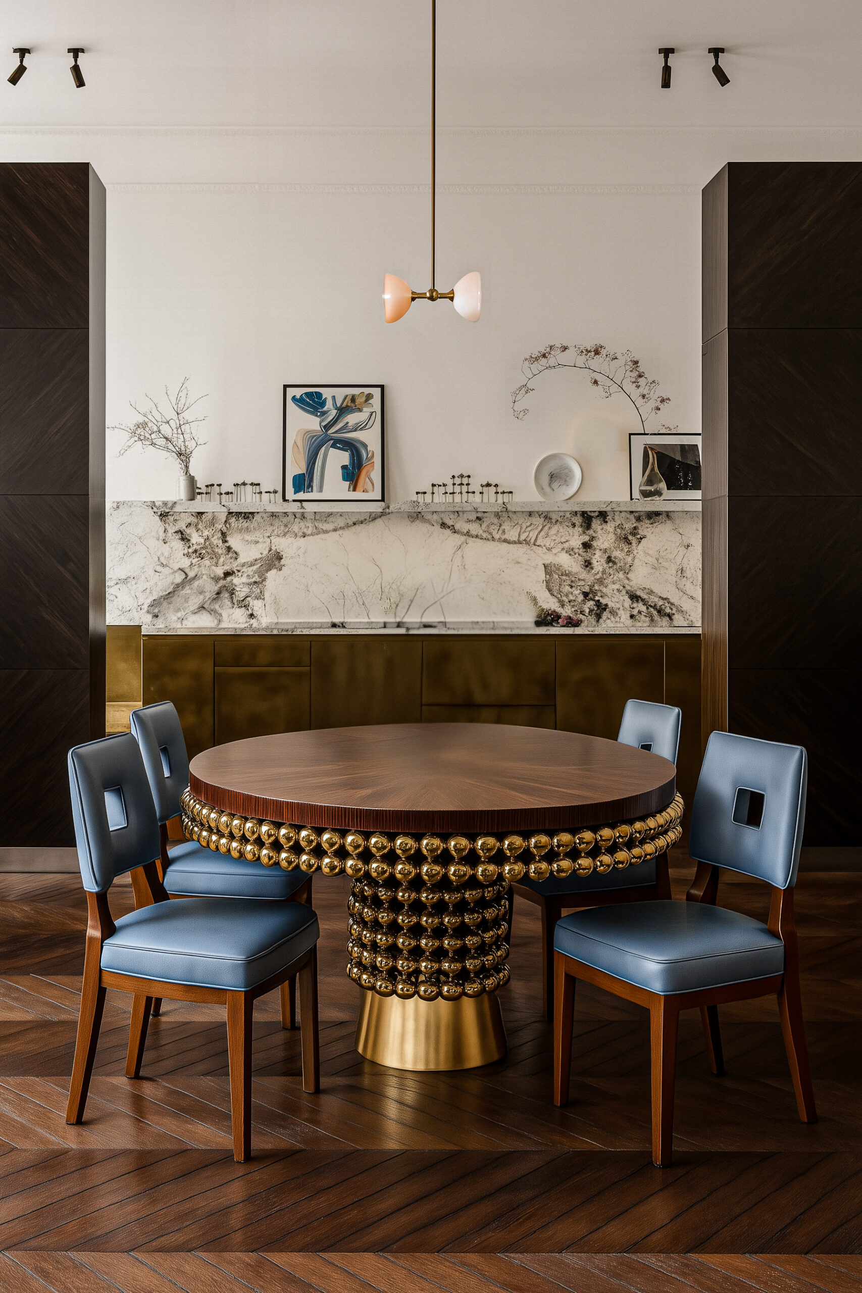Beneath the tabletop is a sculptural base made of clusters of spherical stainless steel , each coated in a polished brass (gold-plated) sheen. The interplay of dark wood and shiny metal creates a timeless and festive overall look .