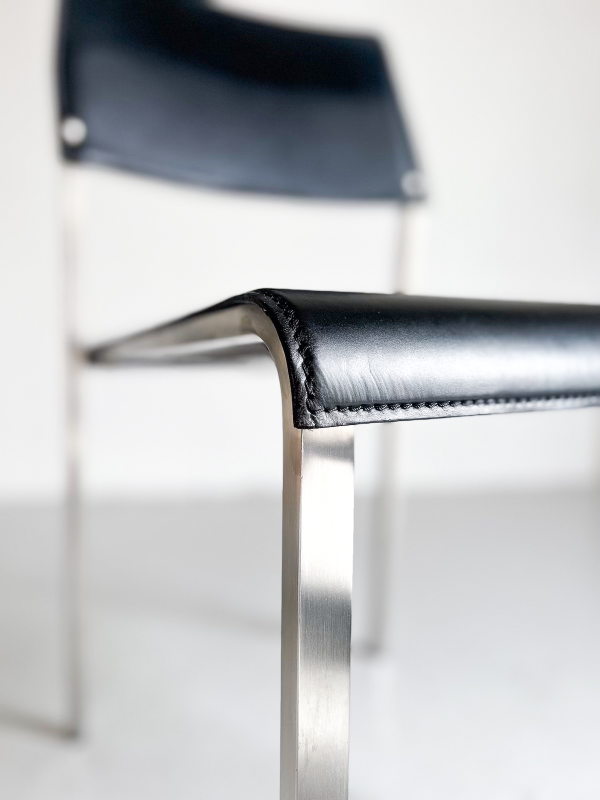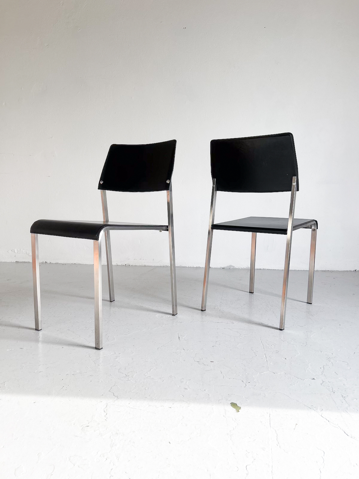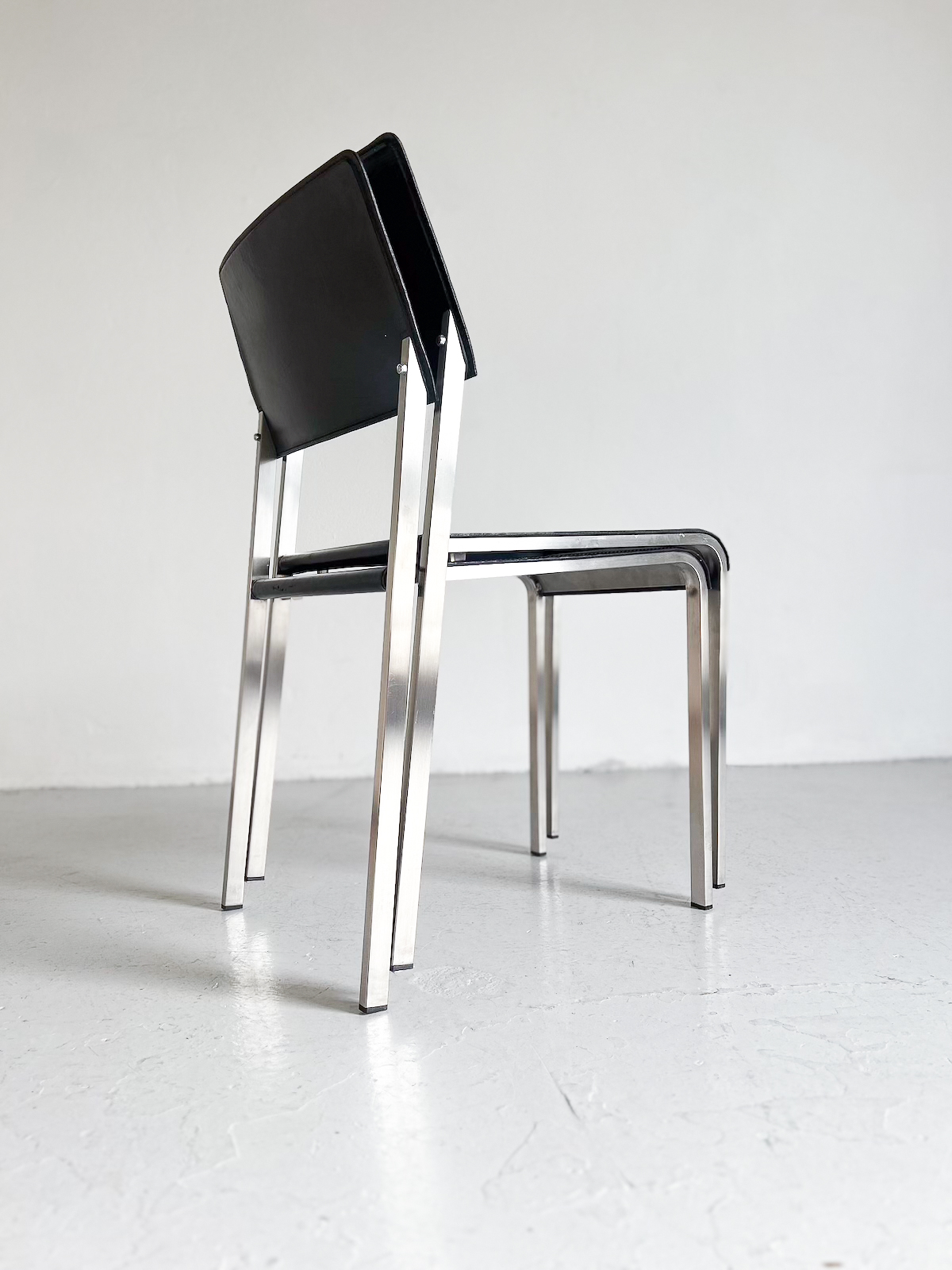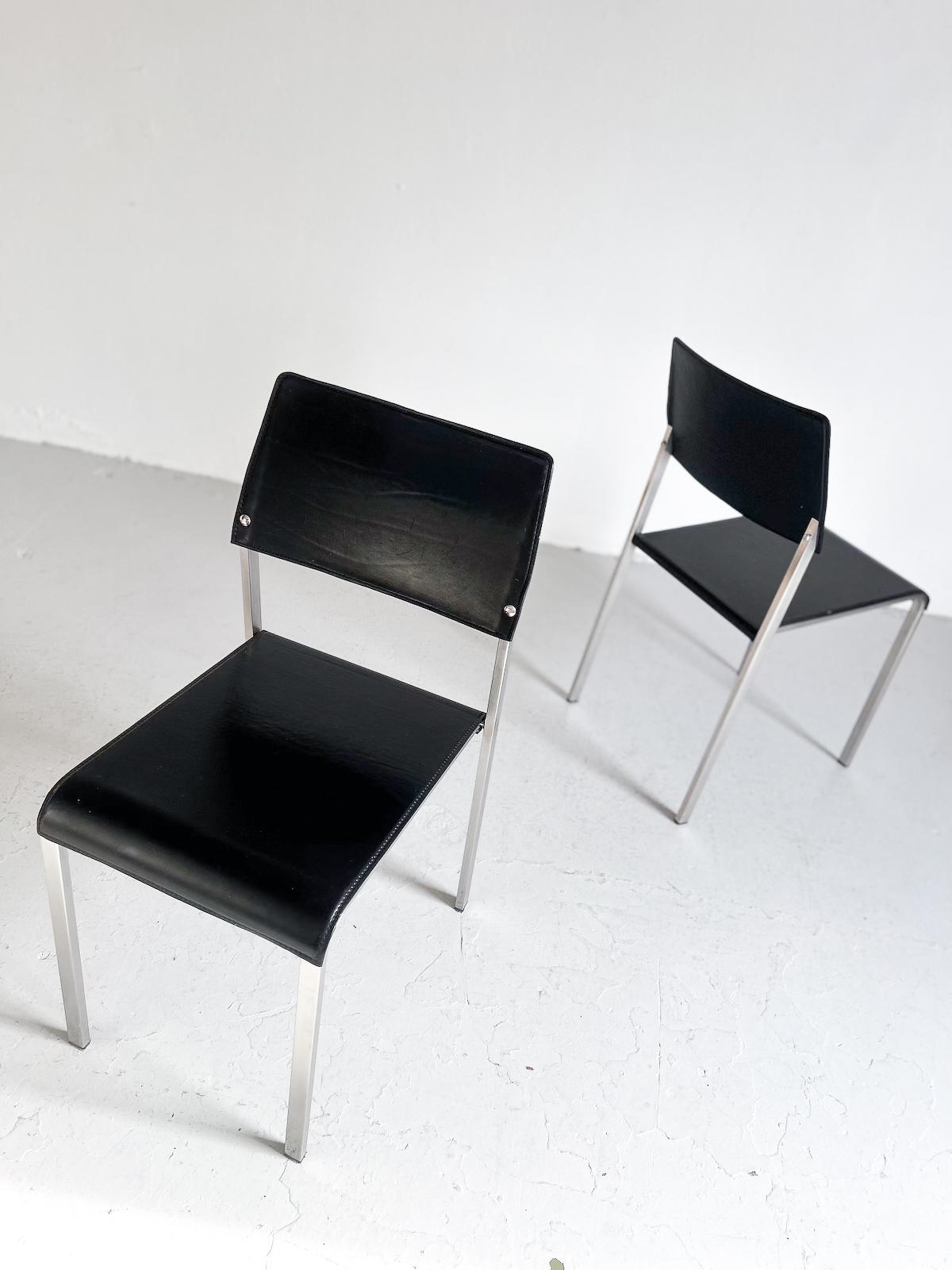 Svart leður og burstað stál. Staflanlegir.