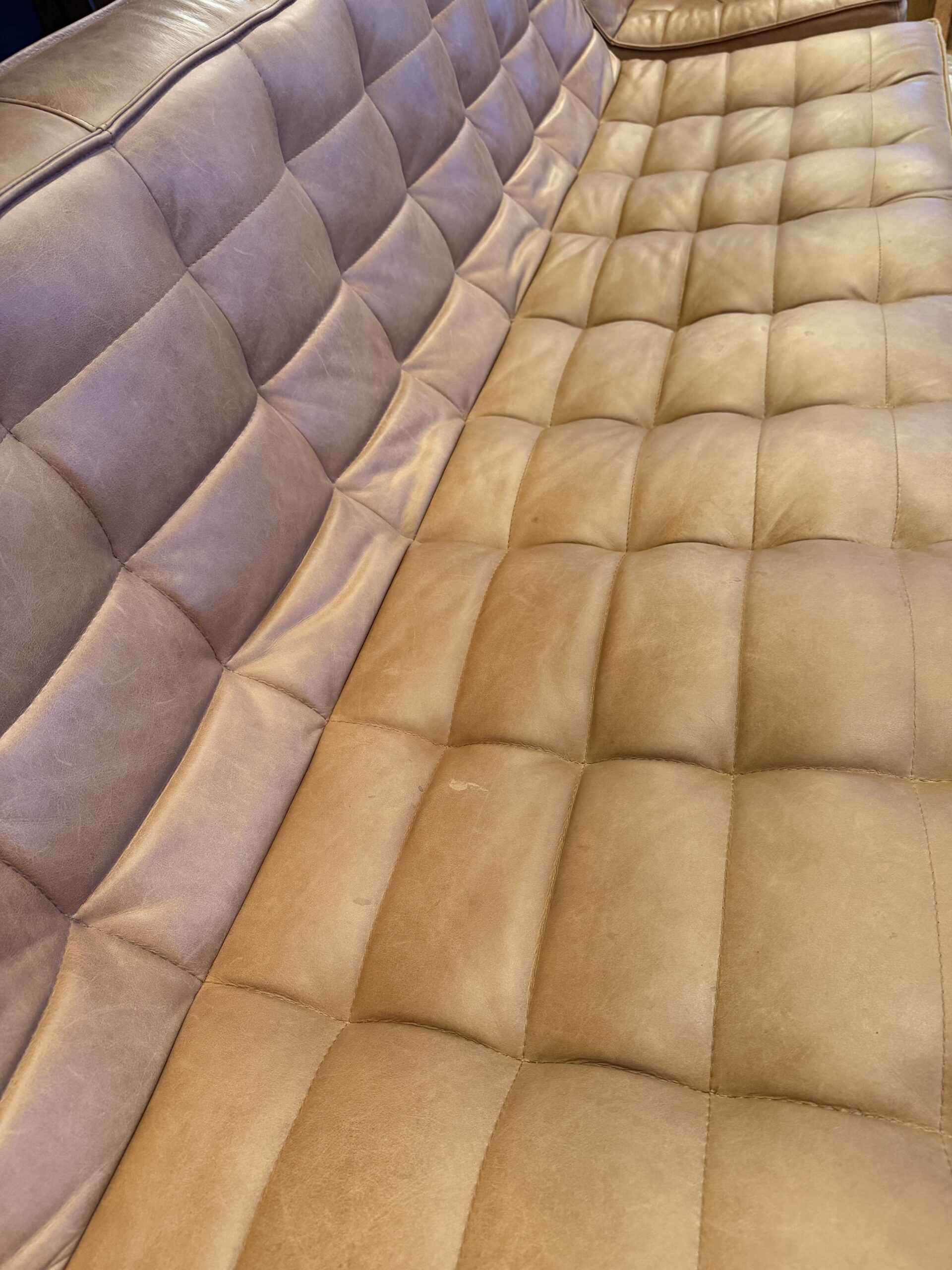 Smá blettir sem ætti að vera hægt að ná úr með eh “leðurtreatment” (sjá mynd) annars vel með farnir. Einn 3ja sæta sófi, eitt horn og tveir skemlar.