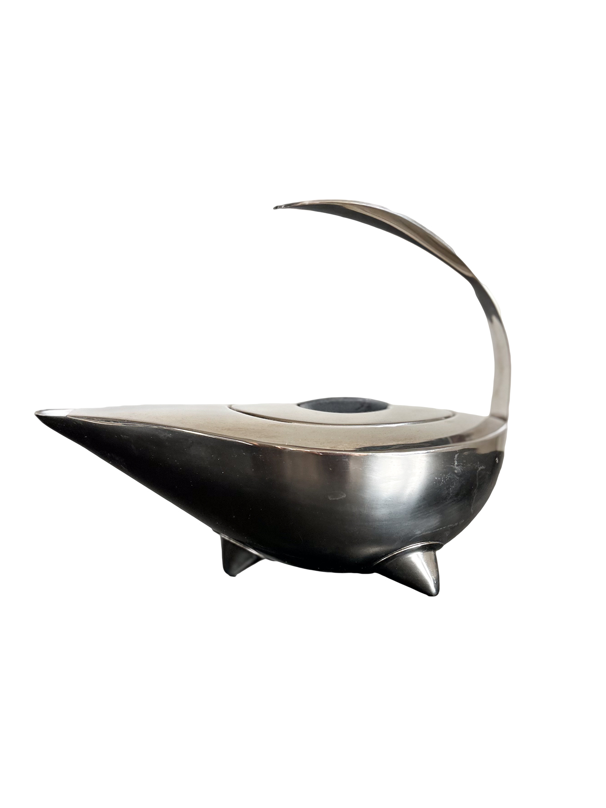 Sjaldgæfur og sérkennilegur teketill úr ryðfríu stáli, hannaður af danska hönnuðinum Carsten Jørgensen fyrir Bodum á 9. áratug síðustu aldar. Hönnunin er skúlptúrísk og minnir á töfrakönnu – með sveigðu handfangi, mjóum stút og hallandi formi. Ketillinn sameinar skandinavíska hreinlínu með sterkri fagurfræði póstmódernismans. Hann var framleiddur í Sviss og er í dag metinn safngripur.