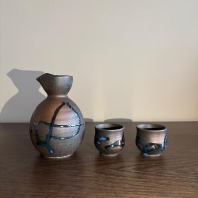 Handgert sake sett, kanna og tveir bollar.