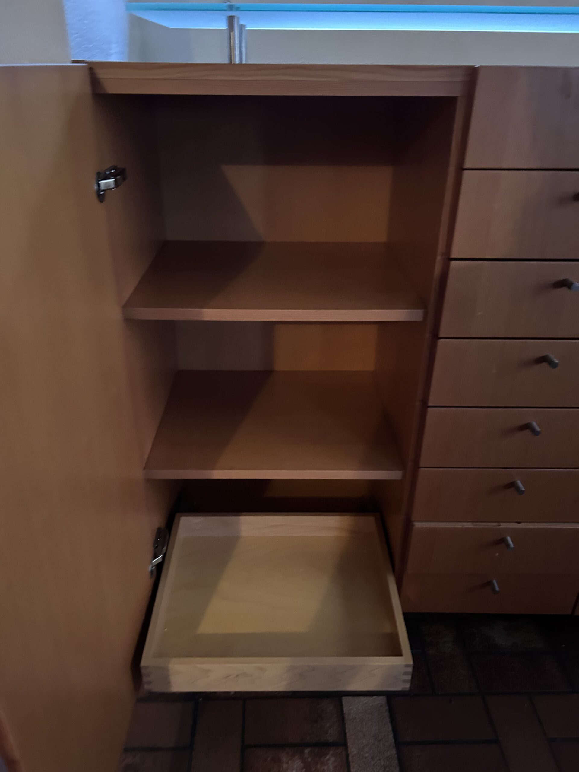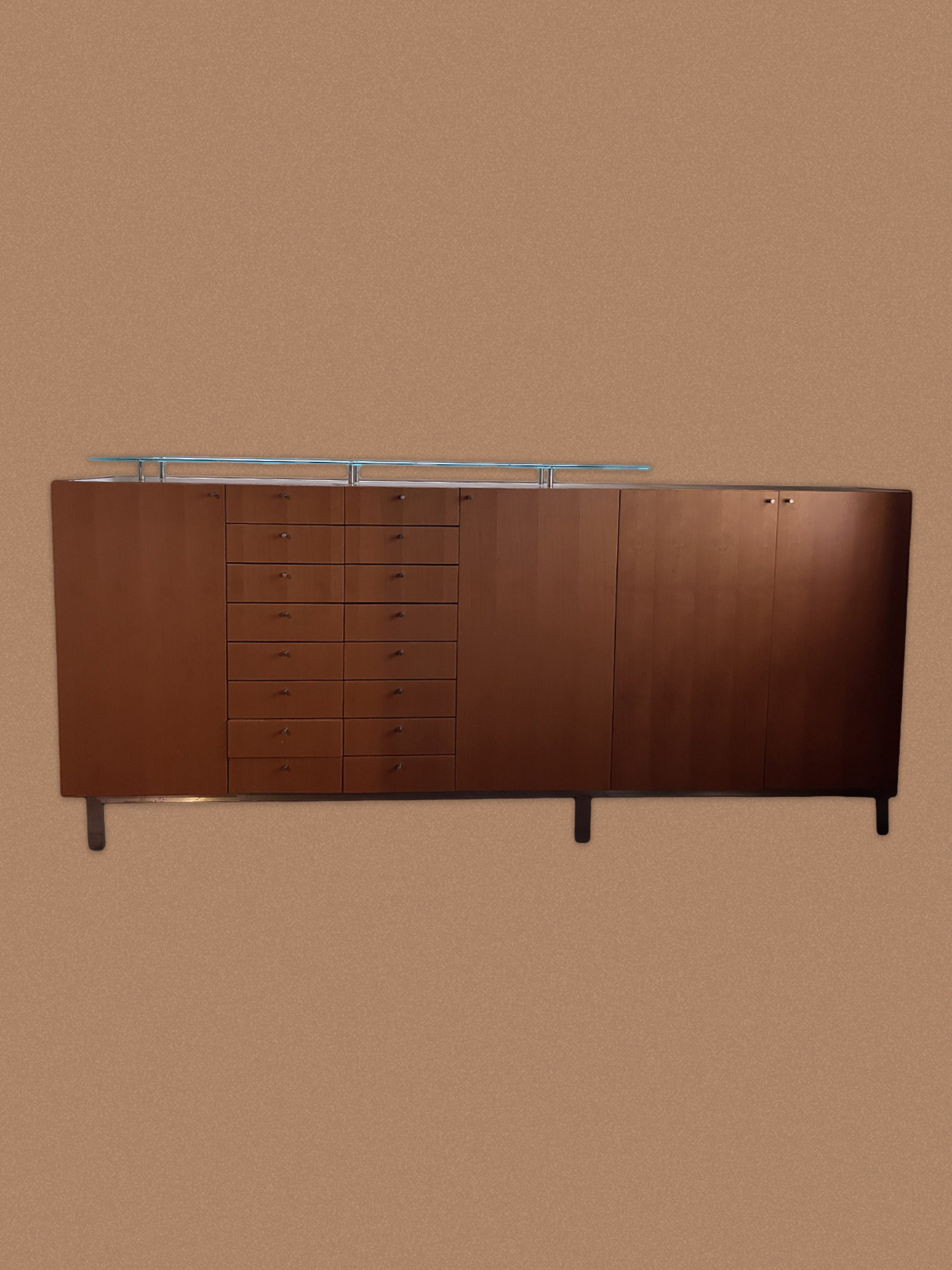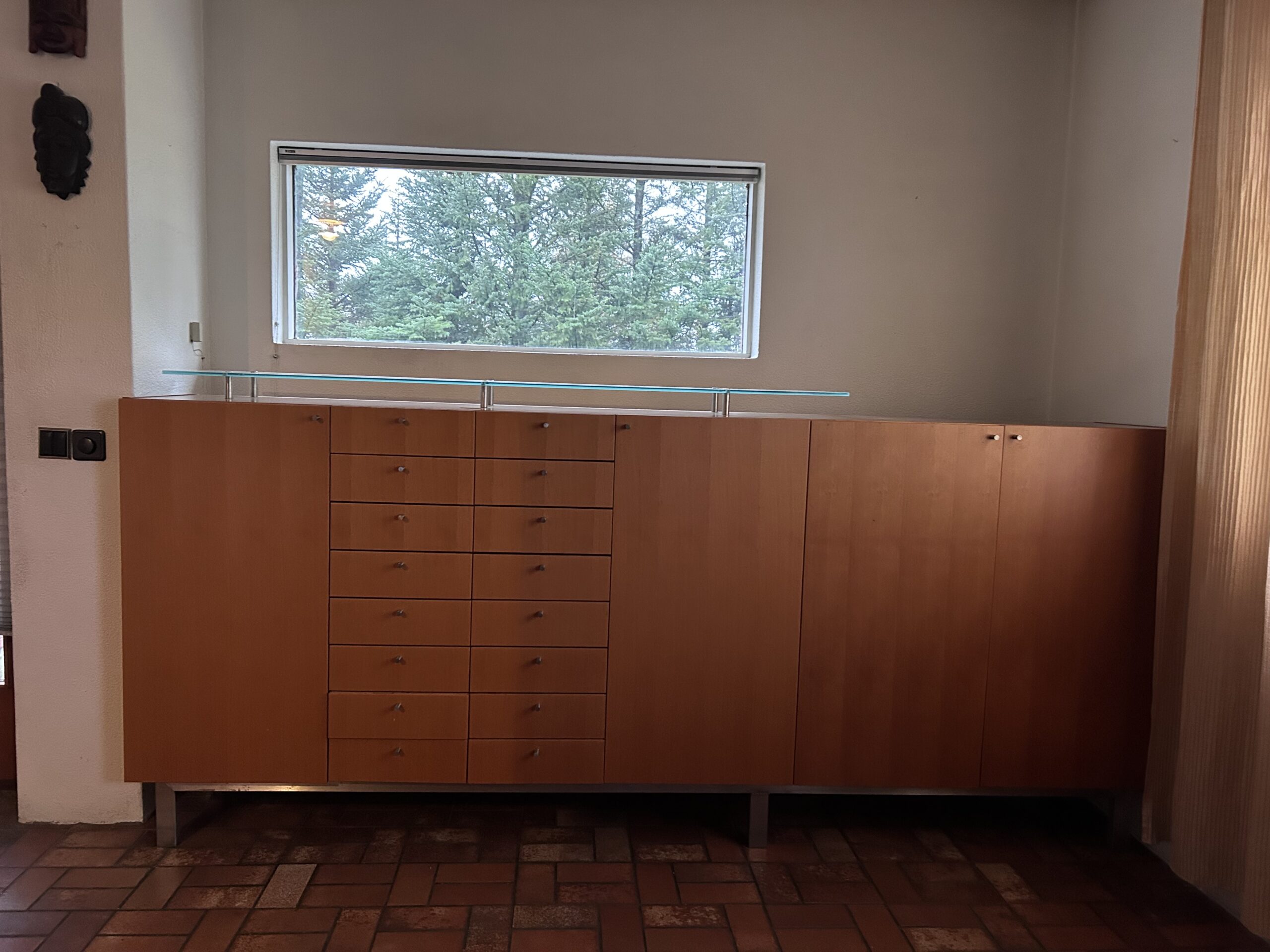 Sérsmíðaður skenkur á Íslandi með margar hirzlur. Hefur glerplötu ofaná sem hylur að hluta og gefur skemmtilegan stíl fyrir muni. Útdraganlegar skúffur og margar minni skúffur.