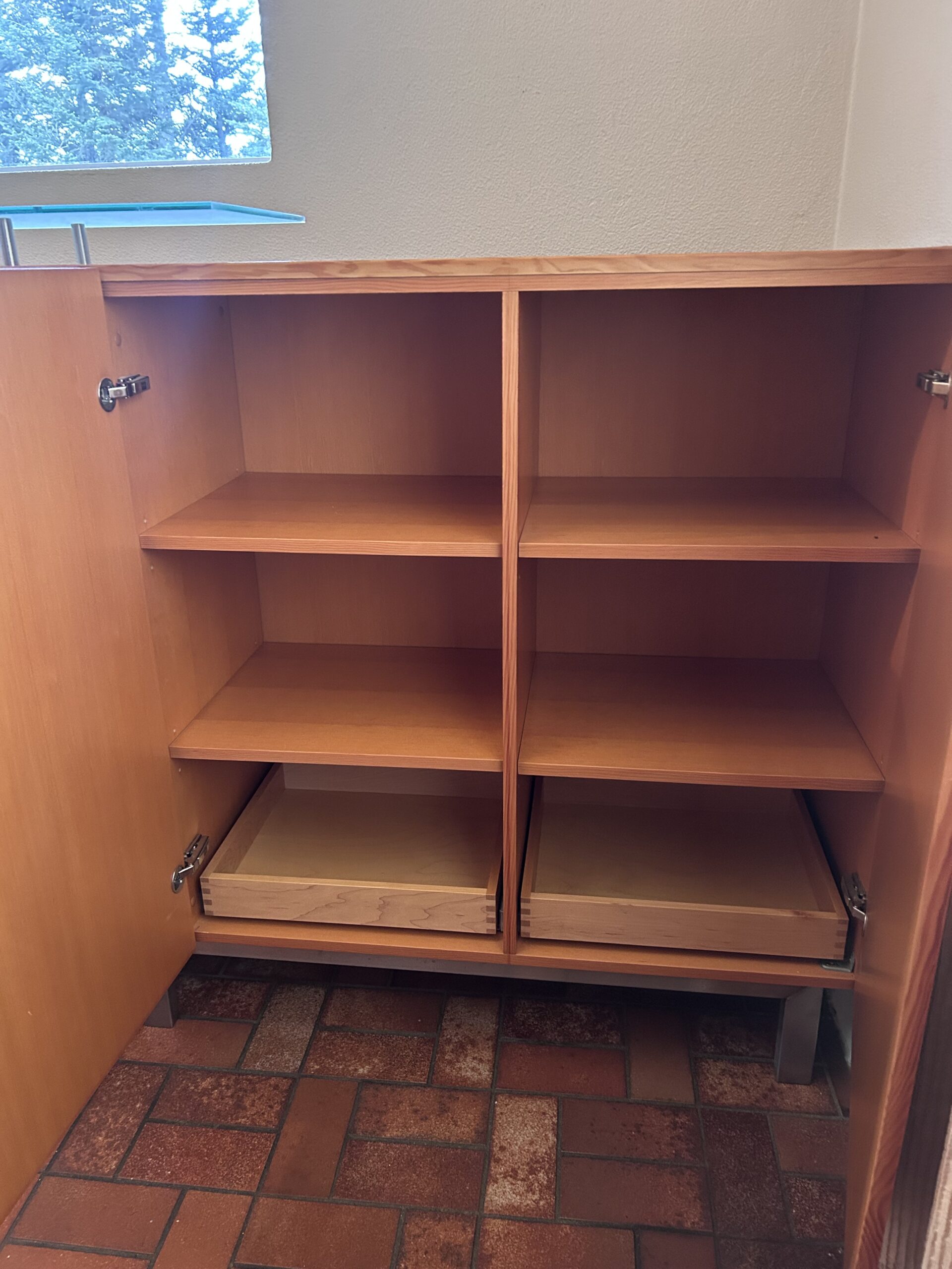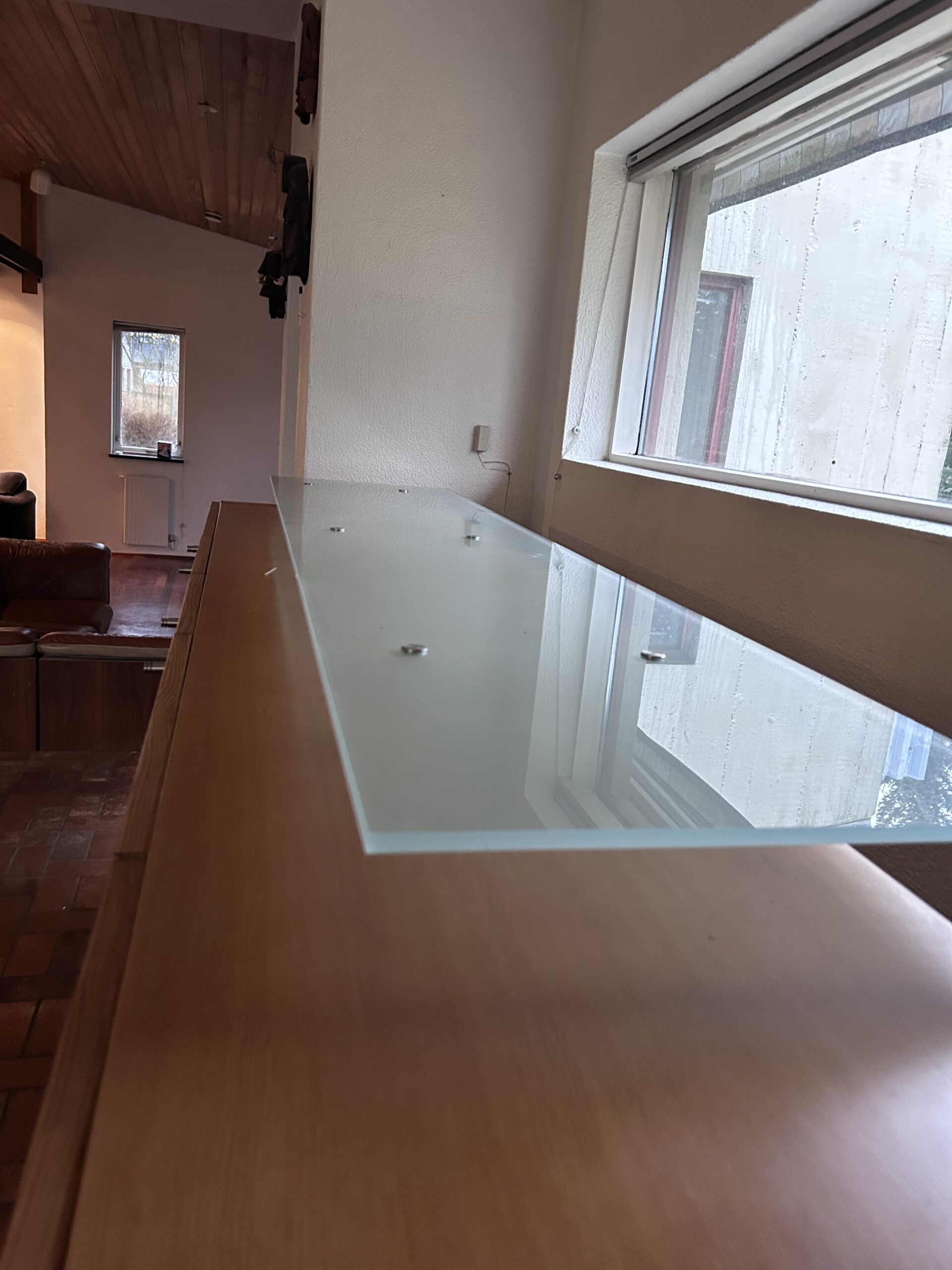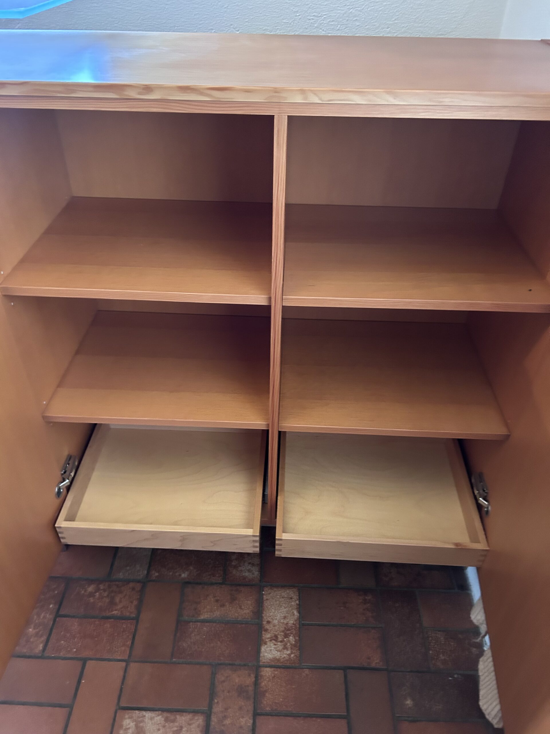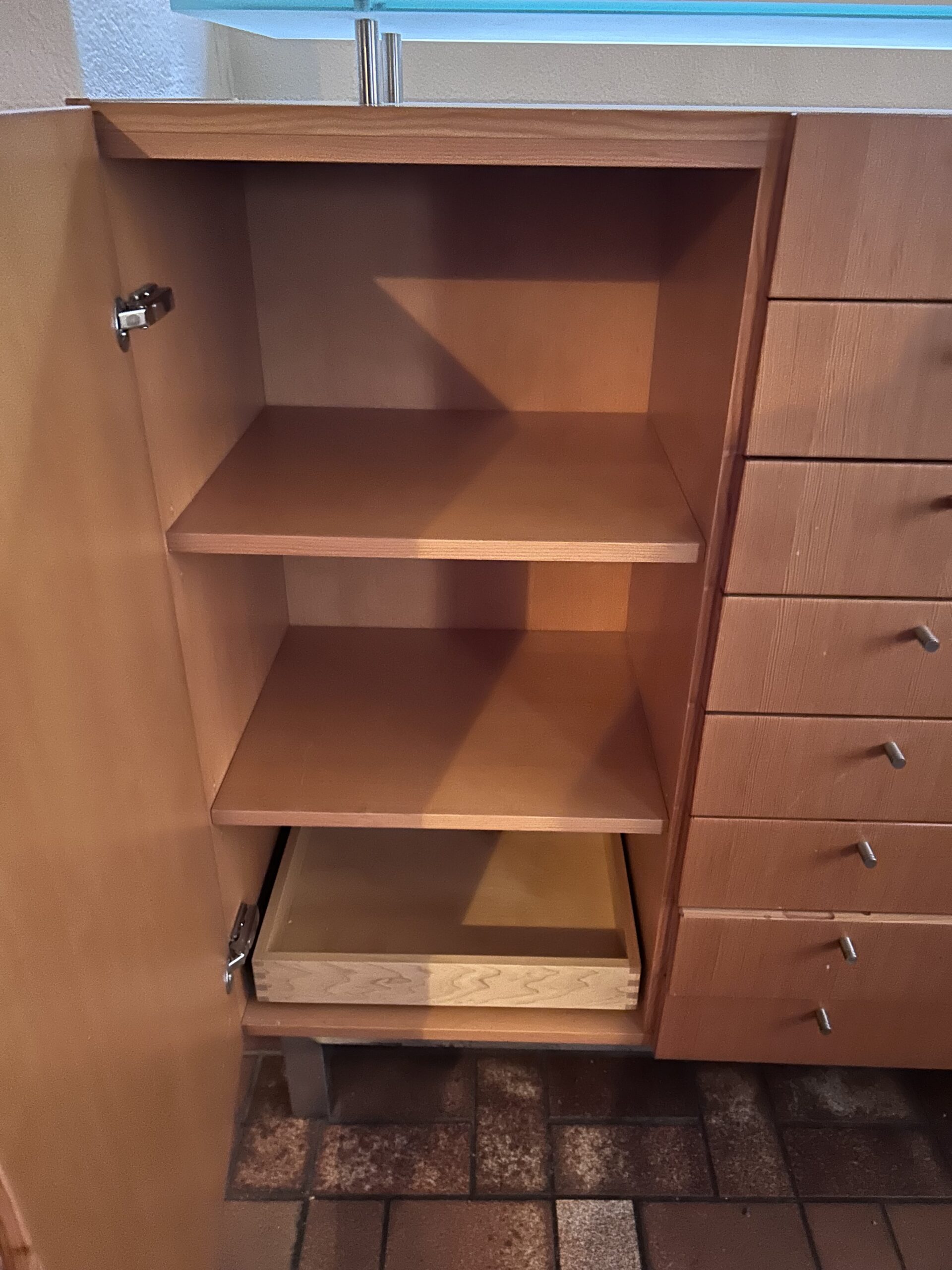 Sérsmíðaður skenkur á Íslandi með margar hirzlur. Hefur glerplötu ofaná sem hylur að hluta og gefur skemmtilegan stíl fyrir muni. Útdraganlegar skúffur og margar minni skúffur.