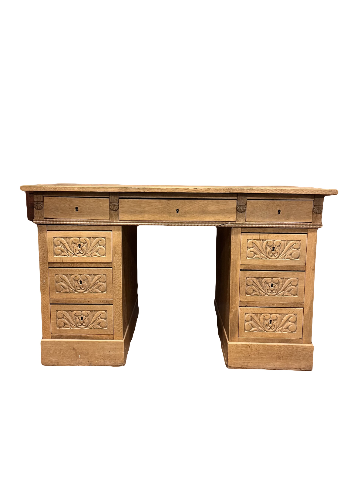 Nett antik skrifborð úr gegnheilli eik. Borðið er í góðu ástandi og stöðugt. Borðið má taka í sundur á einfaldan hátt og því auðvelt að flytja.