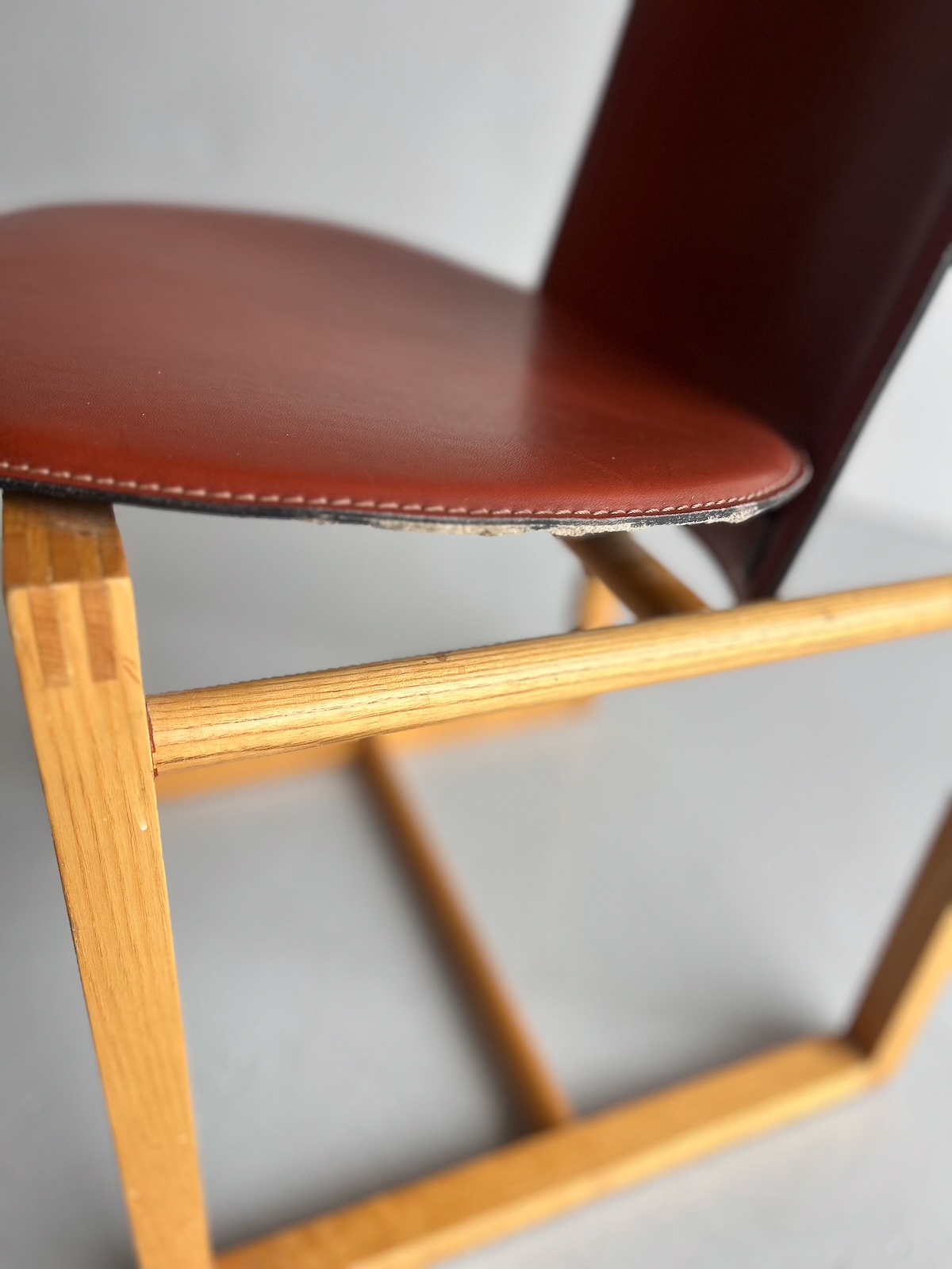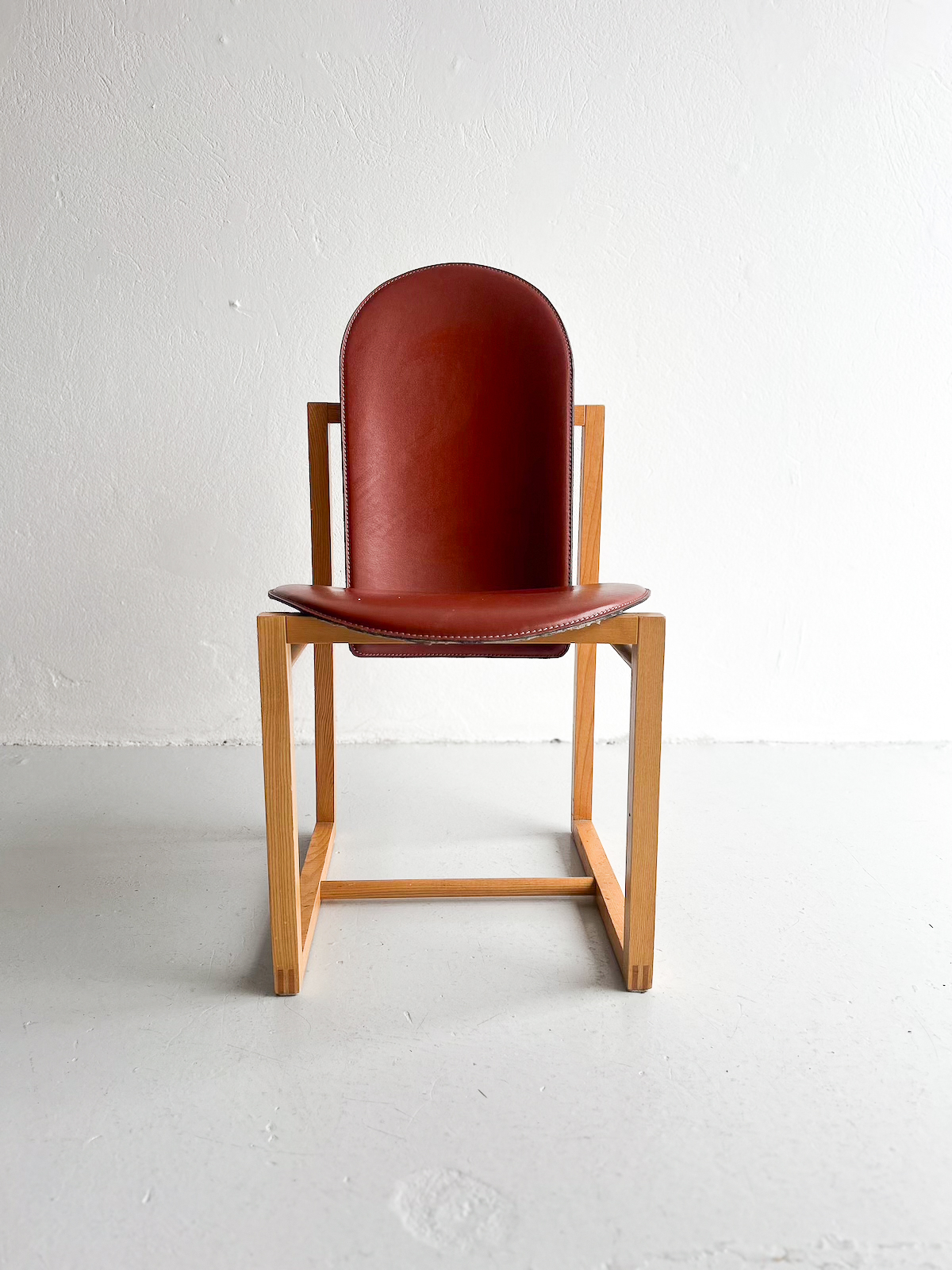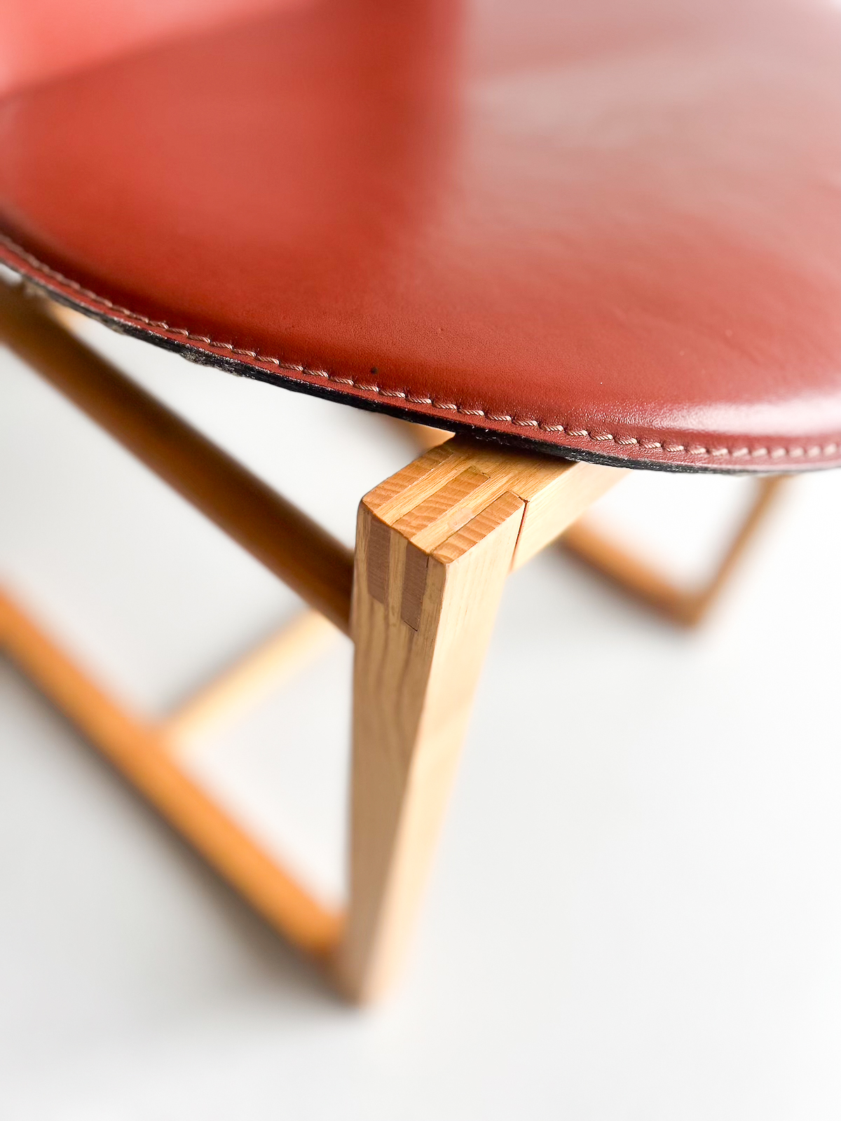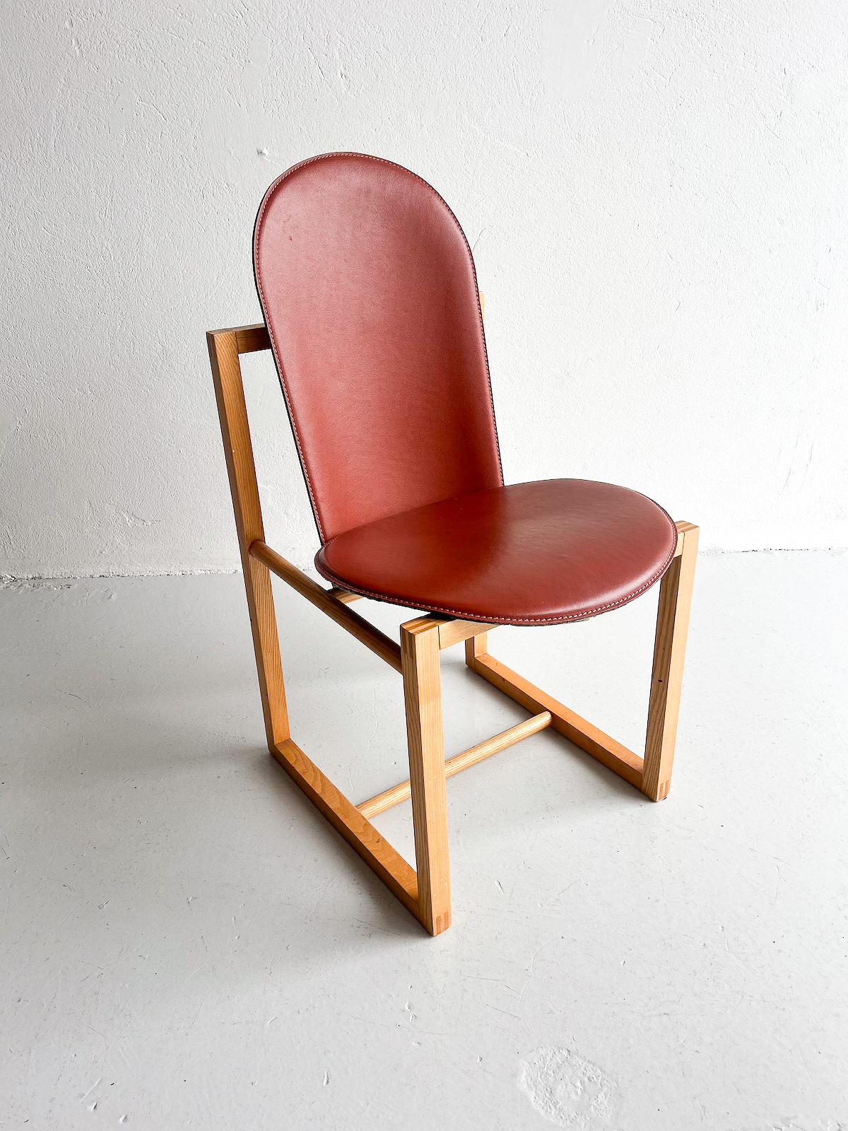 Glæsilegur stóll, geirnegldur viðarrammi og rauðbrún seta. Í góðu ástandi en farið að sjá á efni undir setu.