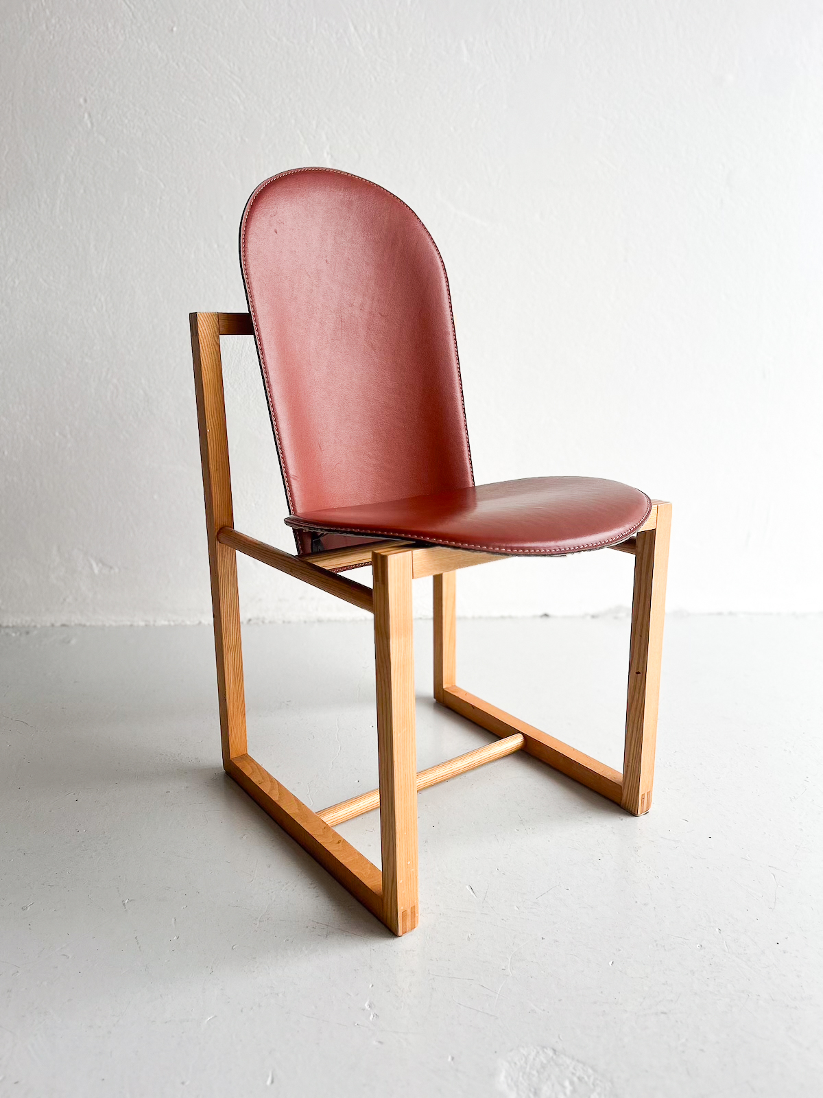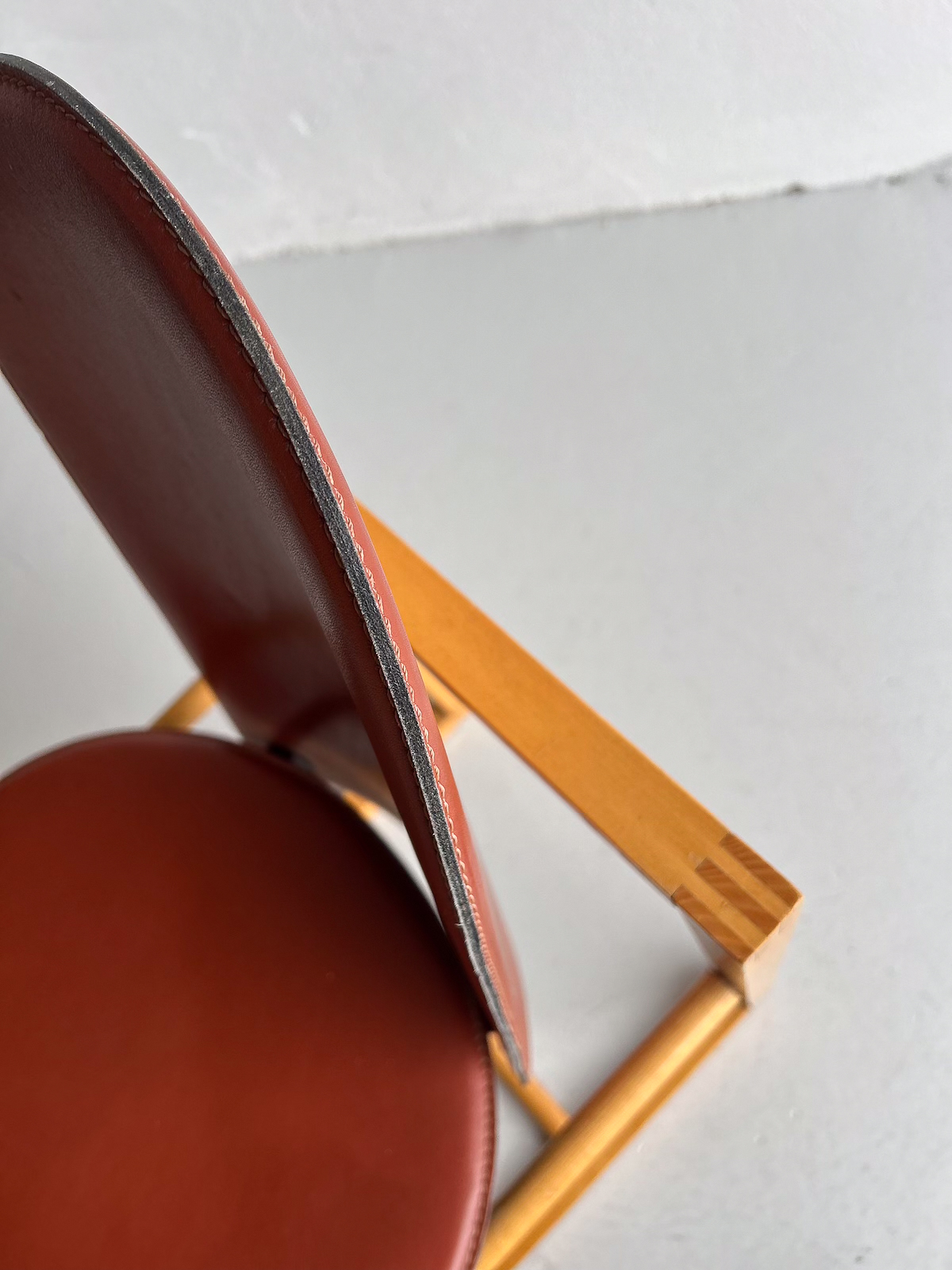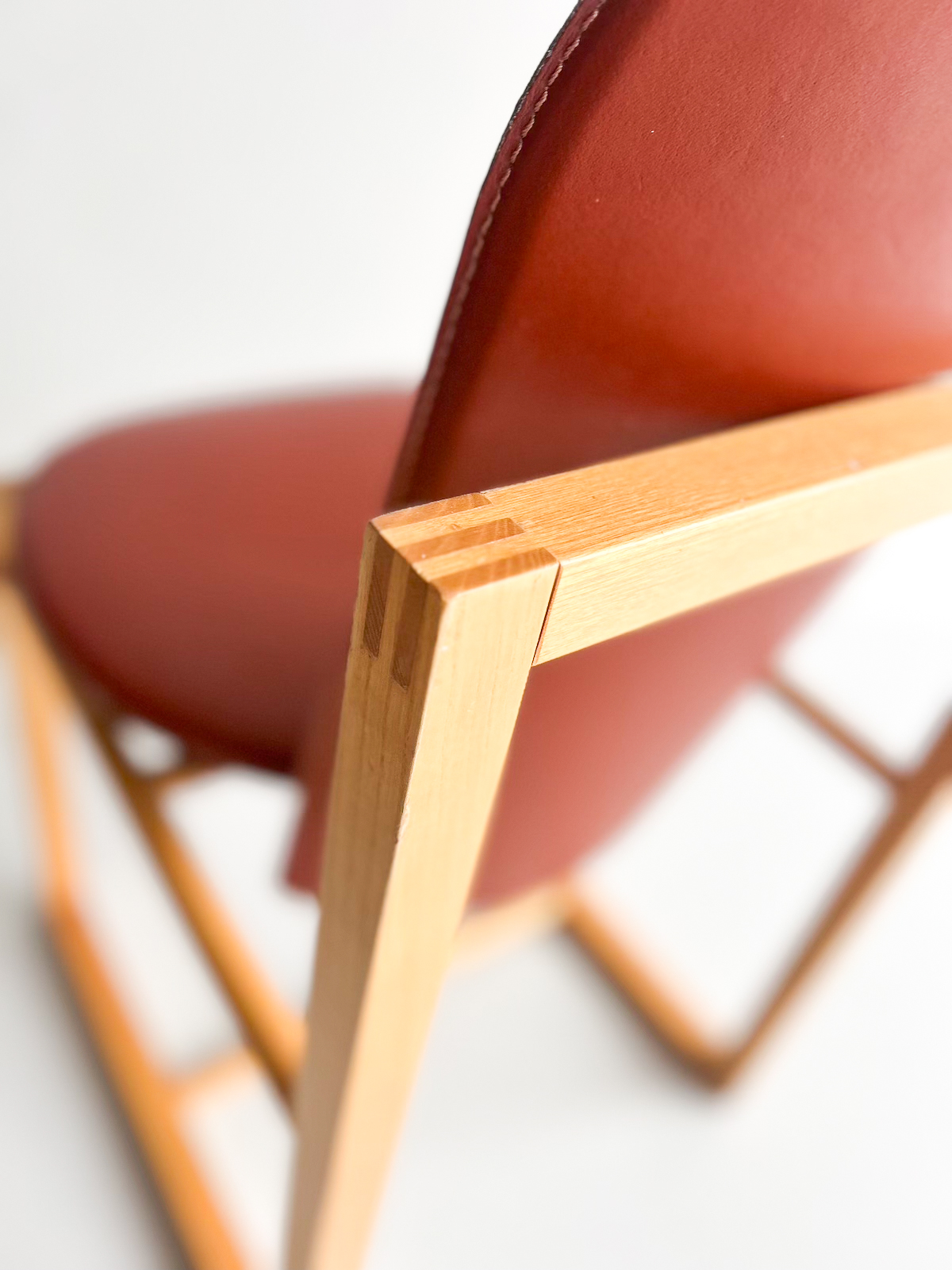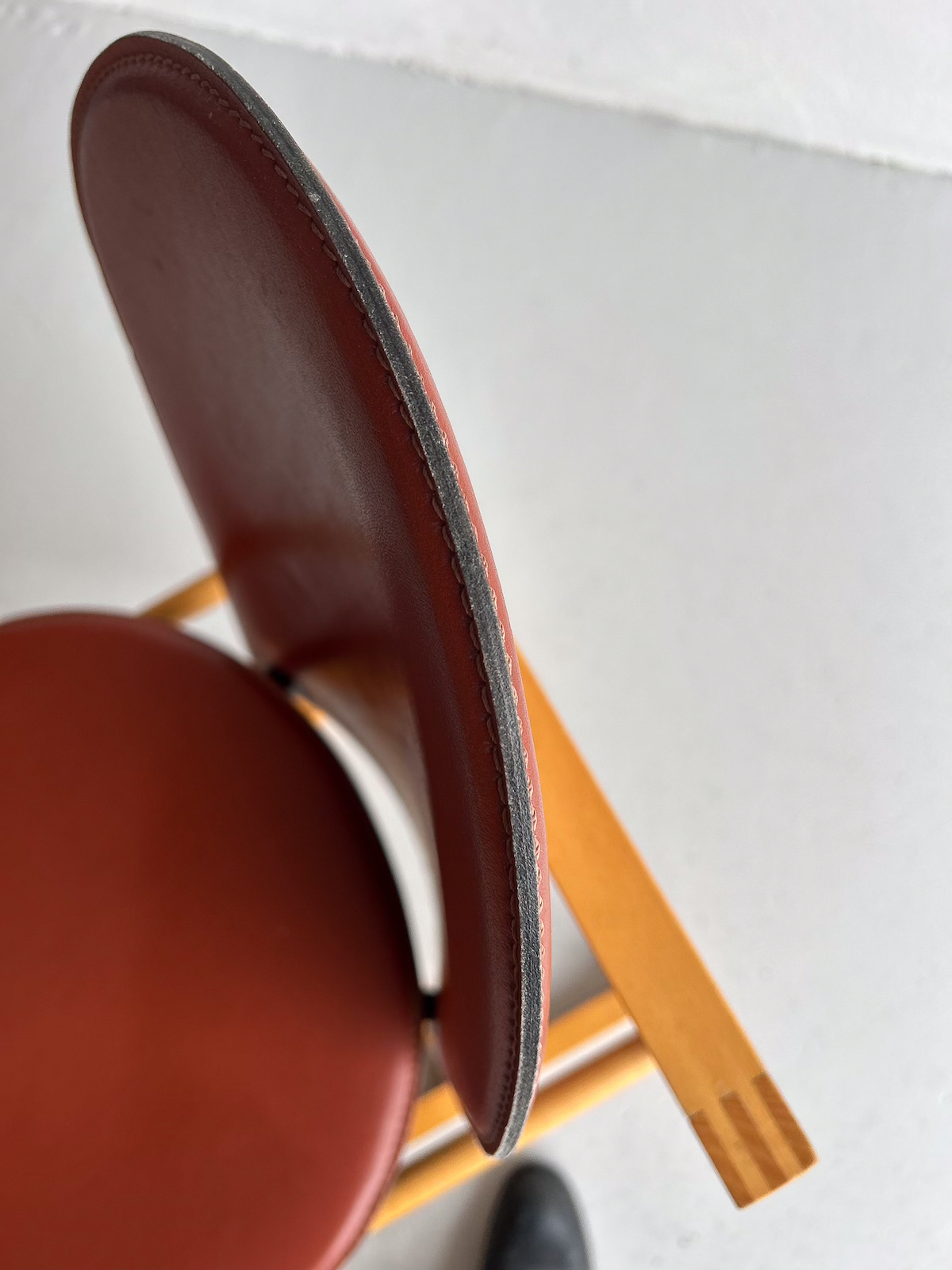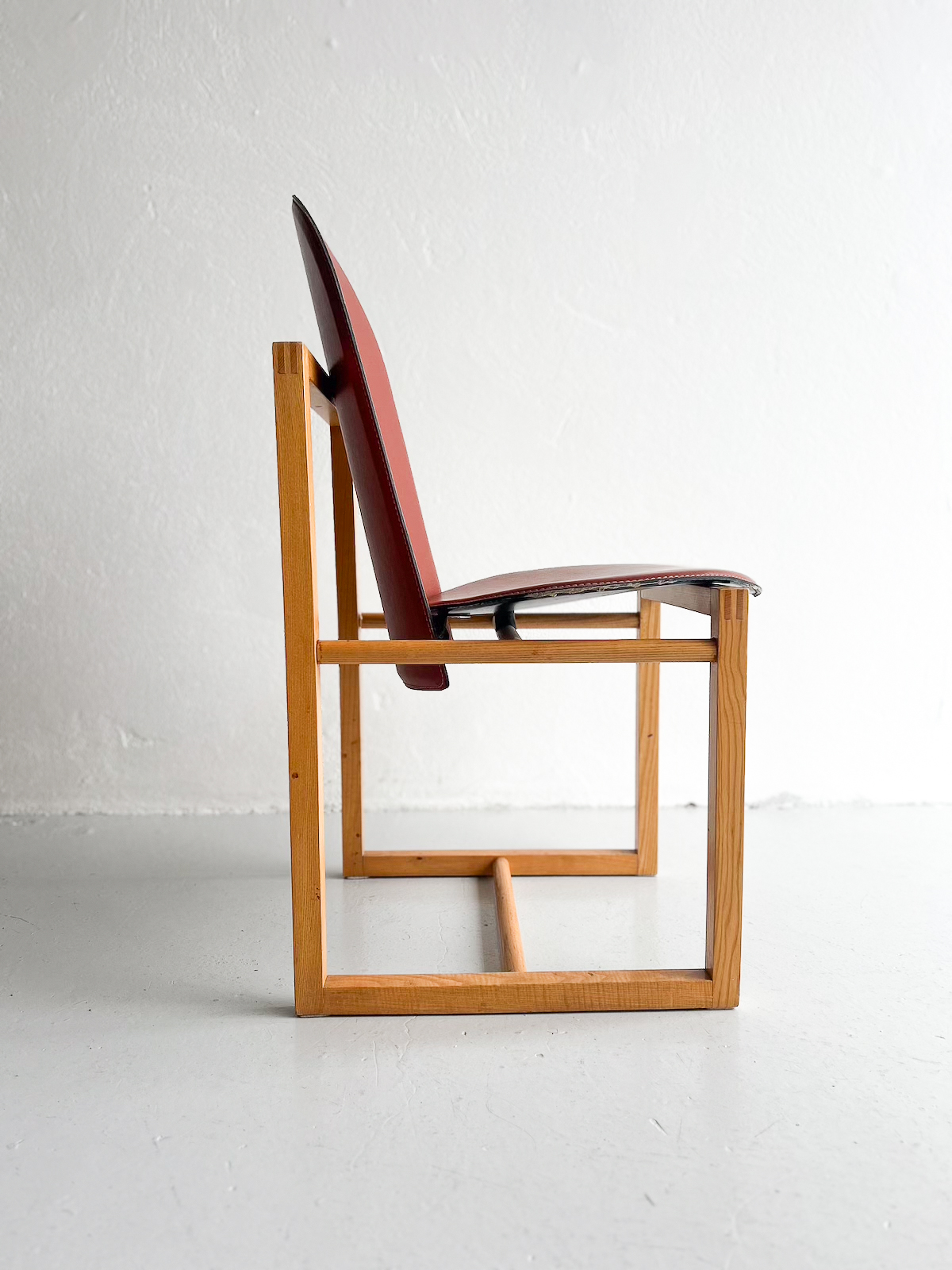 Glæsilegur stóll, geirnegldur viðarrammi og rauðbrún seta. Í góðu ástandi en farið að sjá á efni undir setu.