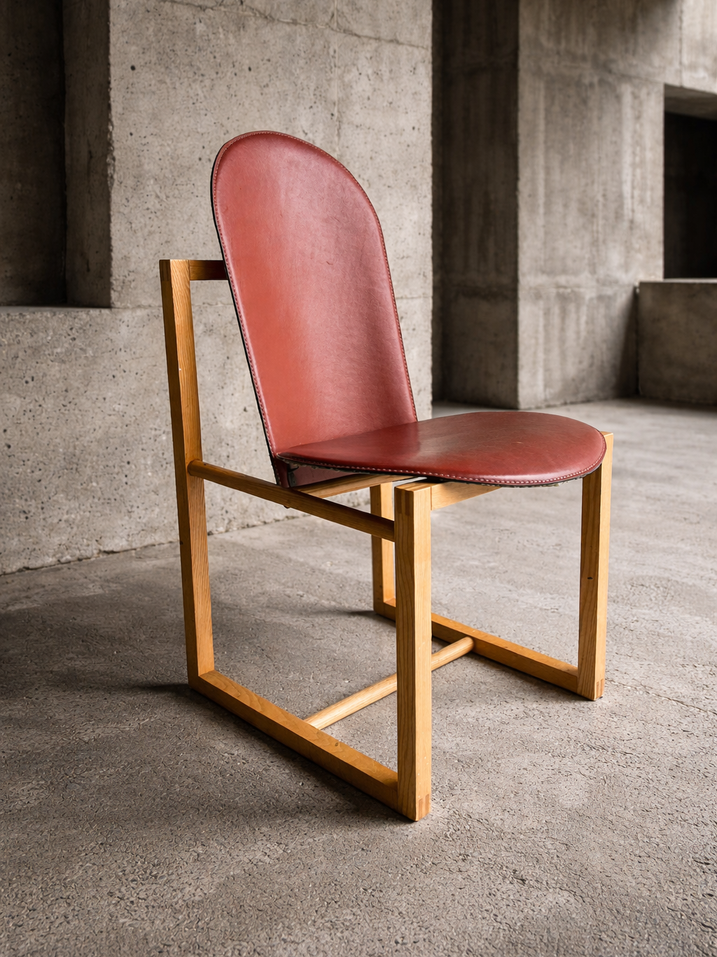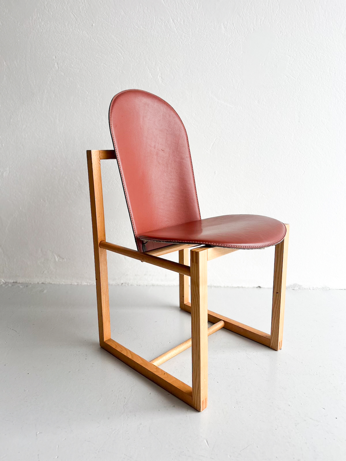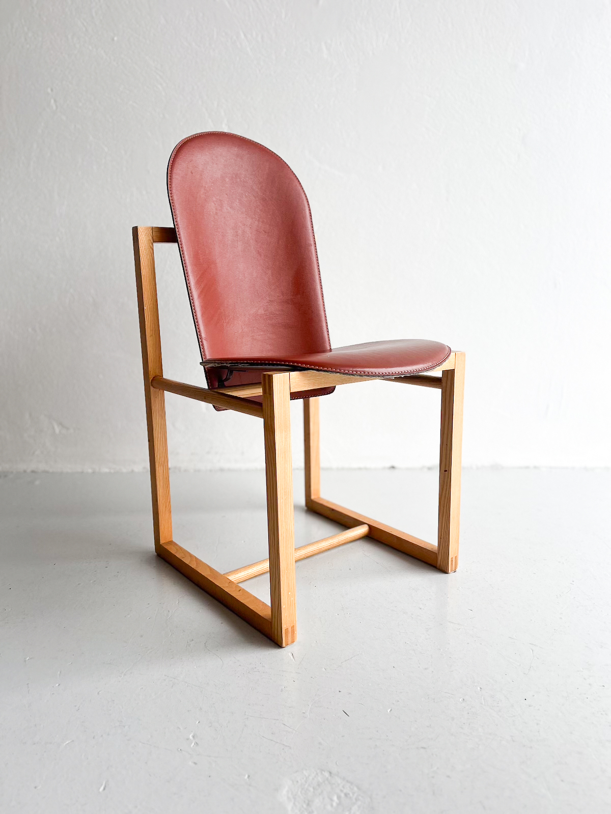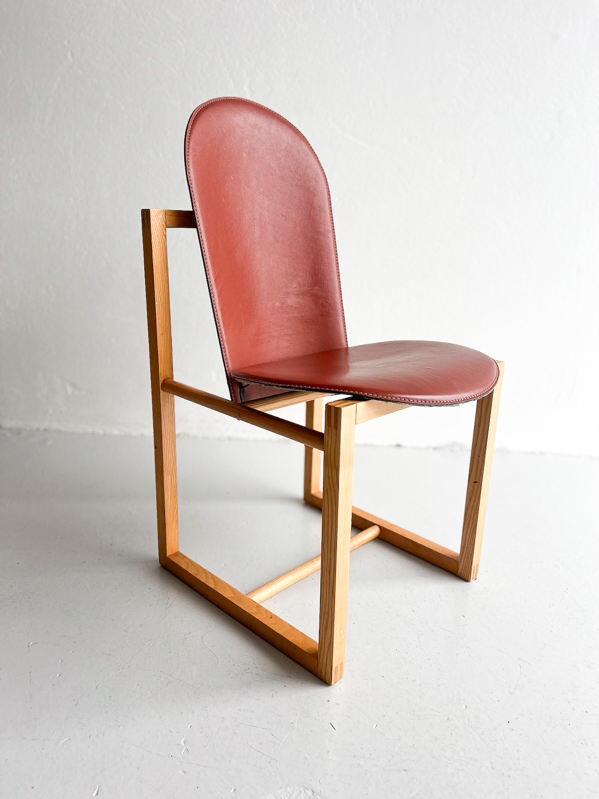 Glæsilegur stóll, geirnegldur viðarrammi og rauðbrún seta. Í góðu ástandi en farið að sjá á efni undir setu.