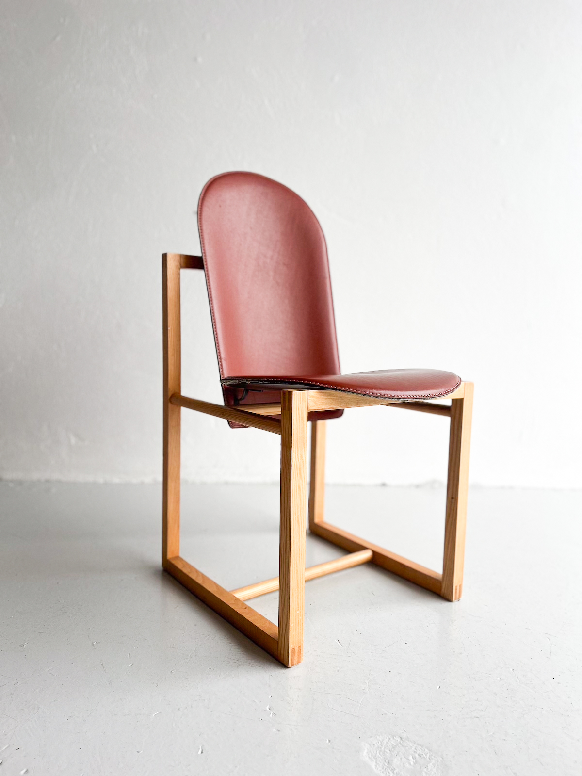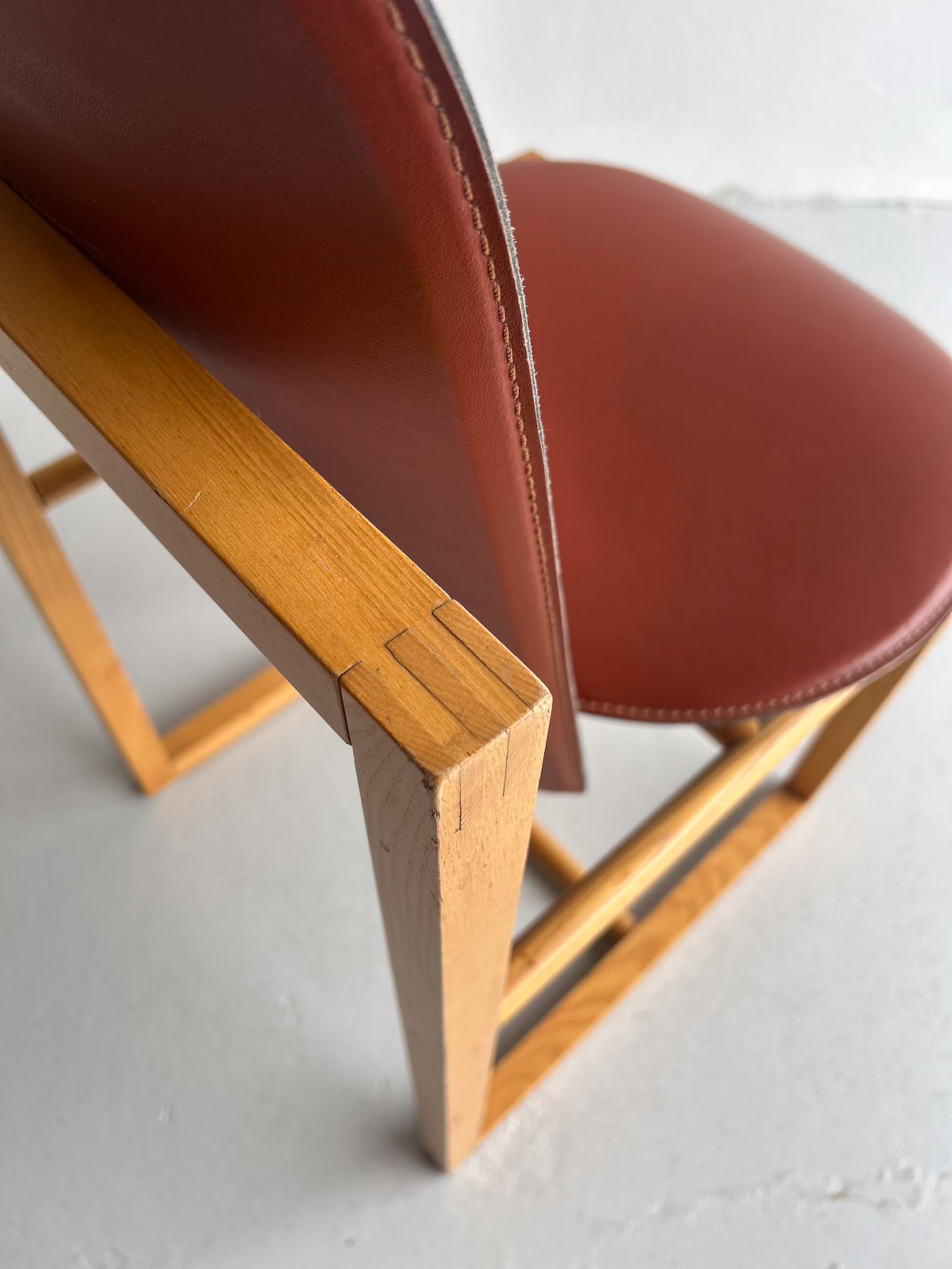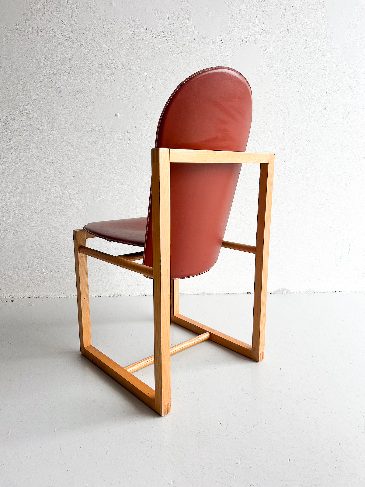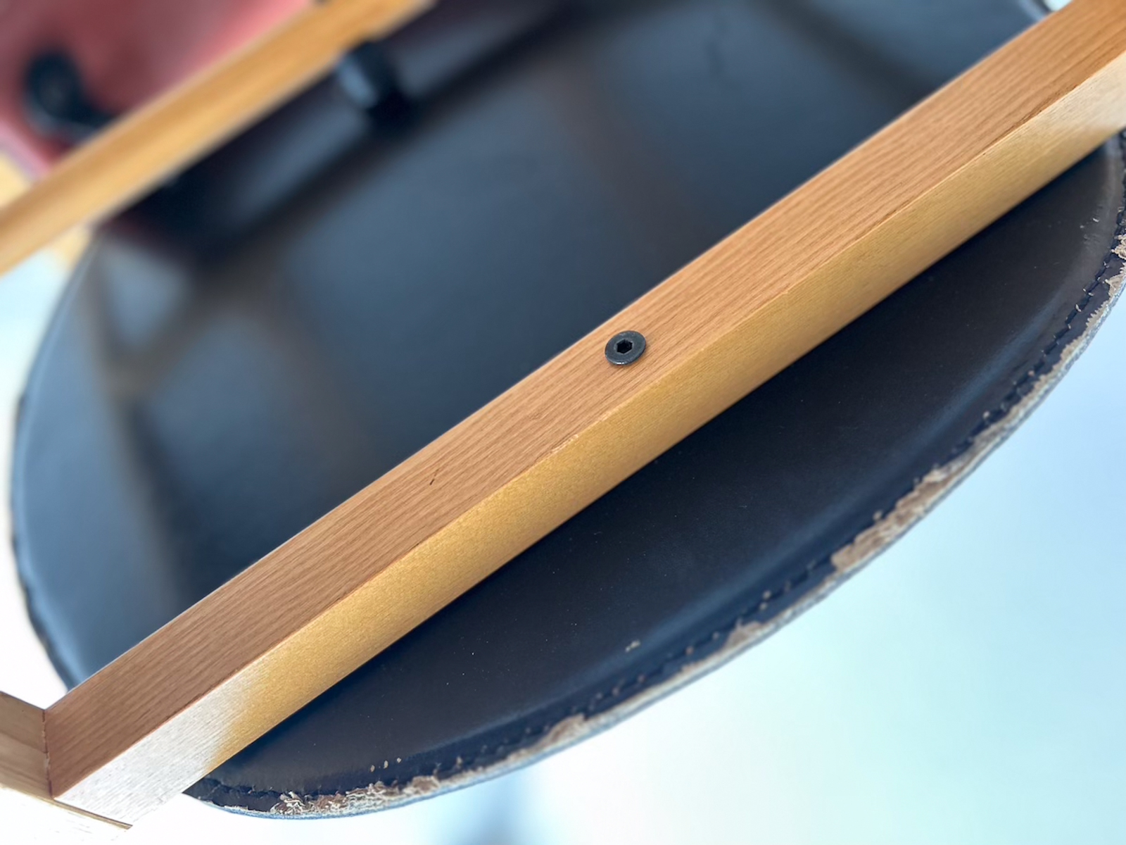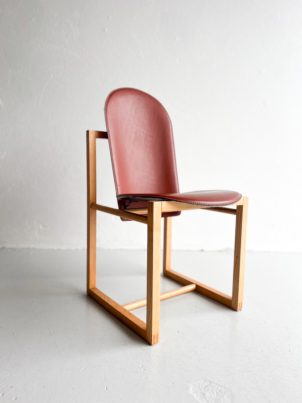 Glæsilegur stóll, geirnegldur viðarrammi og rauðbrún seta. Í góðu ástandi en farið að sjá á efni undir setu.