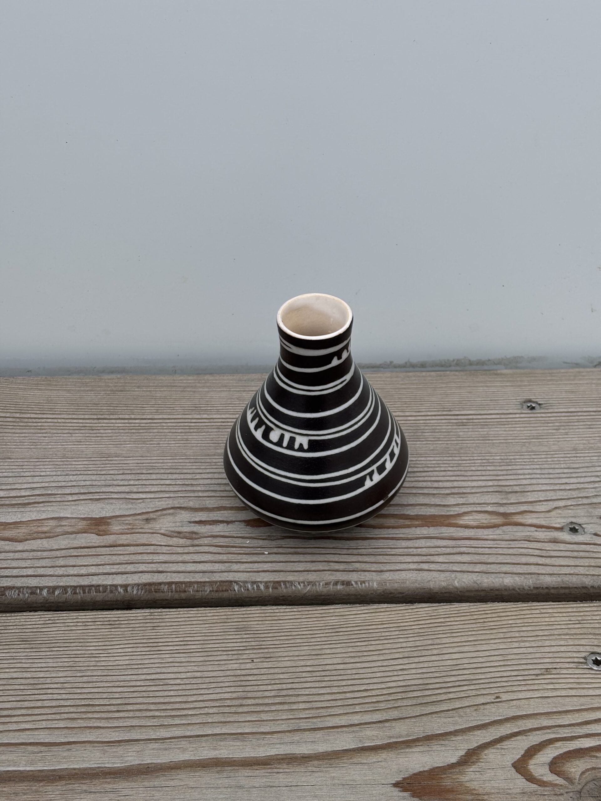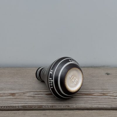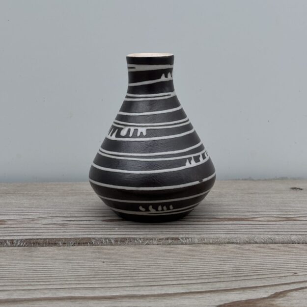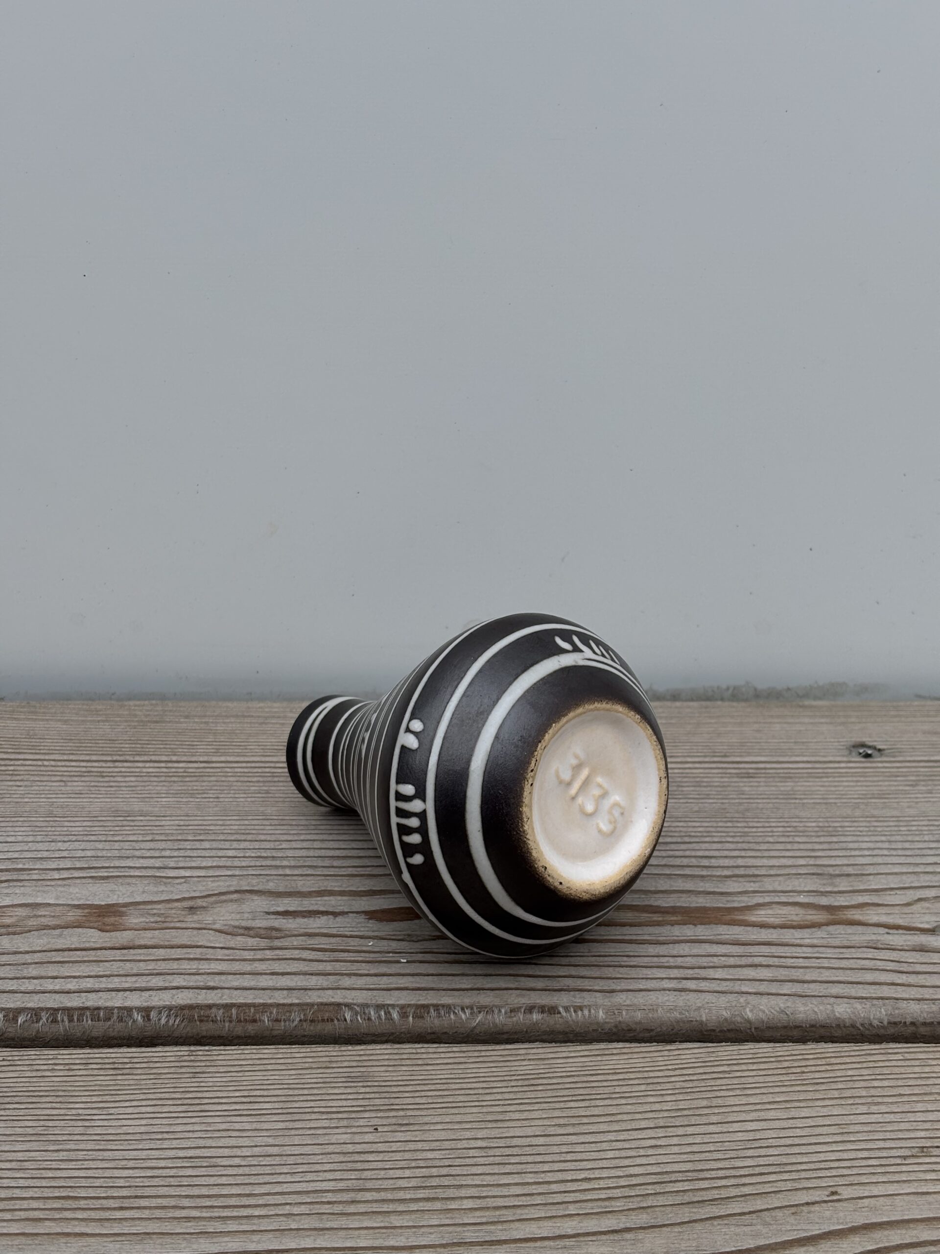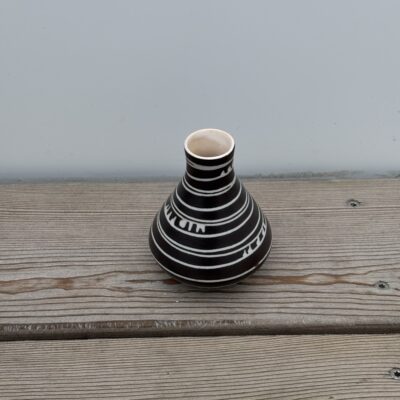 Fallegur keramík vasi, svarbrúnn með hvítu mynstri.