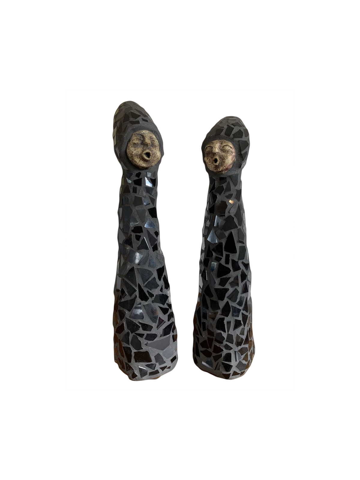 Tveir skúlptúrar úr keramiki og mósaík eftir Sólveigu Hólmarsdóttur, gerðir fyrir u.þ.b. 20 árum.